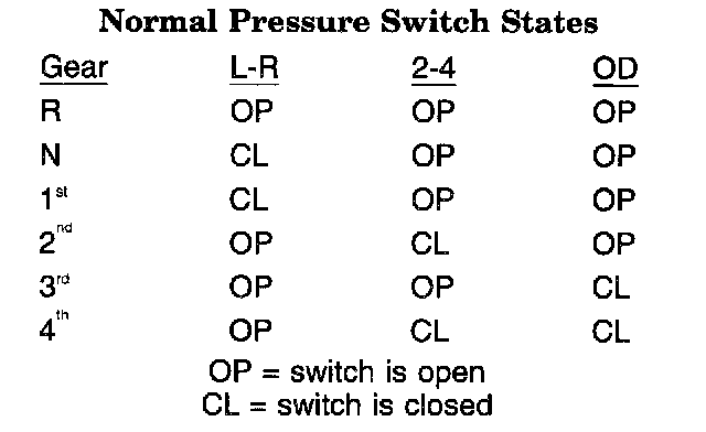 Theory of Operation: The Transmission system uses three pressure switches to monitor the fluid pressure in the L-R, 2-4, and OD elements. The pressure switches are continuously monitored for the correct states in each gear as shown below.