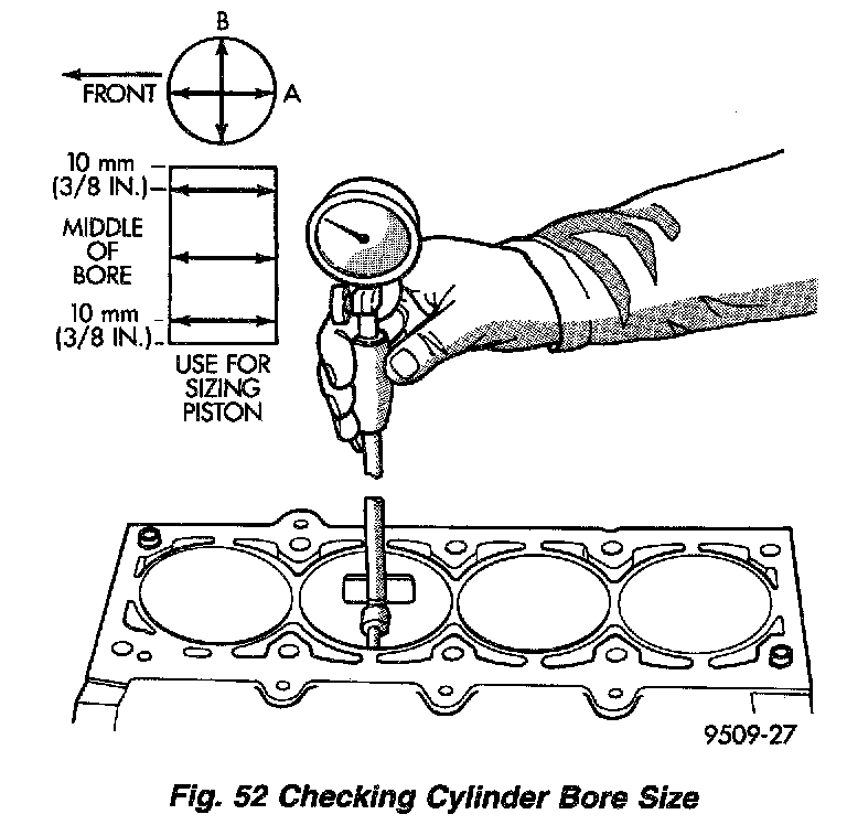 Measure the cylinder bore at three levels in directions A and B (Fig. 52). Top measurement should be 10 mm (3/8 inch) down and bottom measurement should be 10 min (3/8 inch) up from bottom of bore. Refer to Specifications.