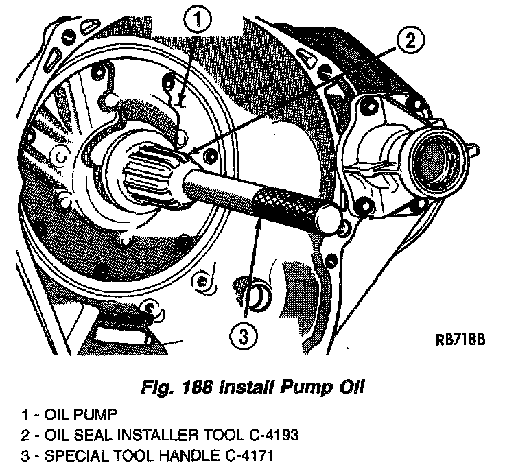 1. To install a new seal, place seal in opening of the pump housing (lip side facing inward). Using Tool C-4193 and Handle Tool C-4171, drive new seal into housing until tool bottoms (Fig. 188).