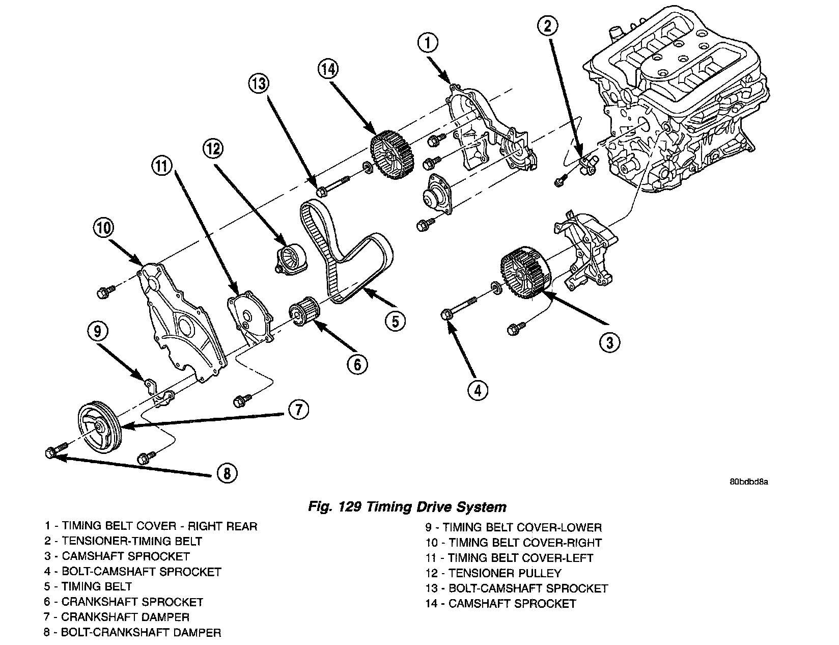 DESCRIPTIONThe timing drive system (Fig. 129) has been designed to provide quiet performance and reliability to support a NON free-wheeling engine.