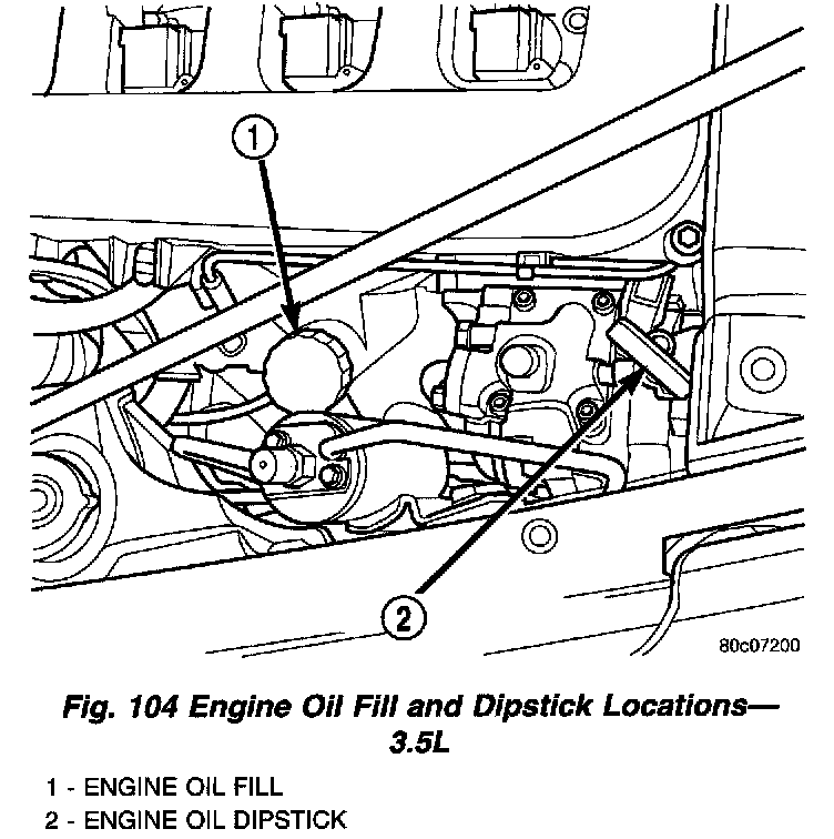 Checking the oil while the vehicle is on level ground will improve the accuracy of the oil level reading (Fig. 104). Add only when the level is at or below the ADD mark.