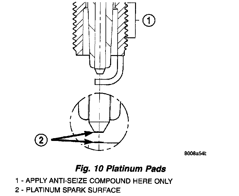 A thin platinum pad is welded to the center electrode end. Extreme care must be used to prevent spark plug cross threading, mis-gaping and ceramic insulator damage during plug removal and installation.