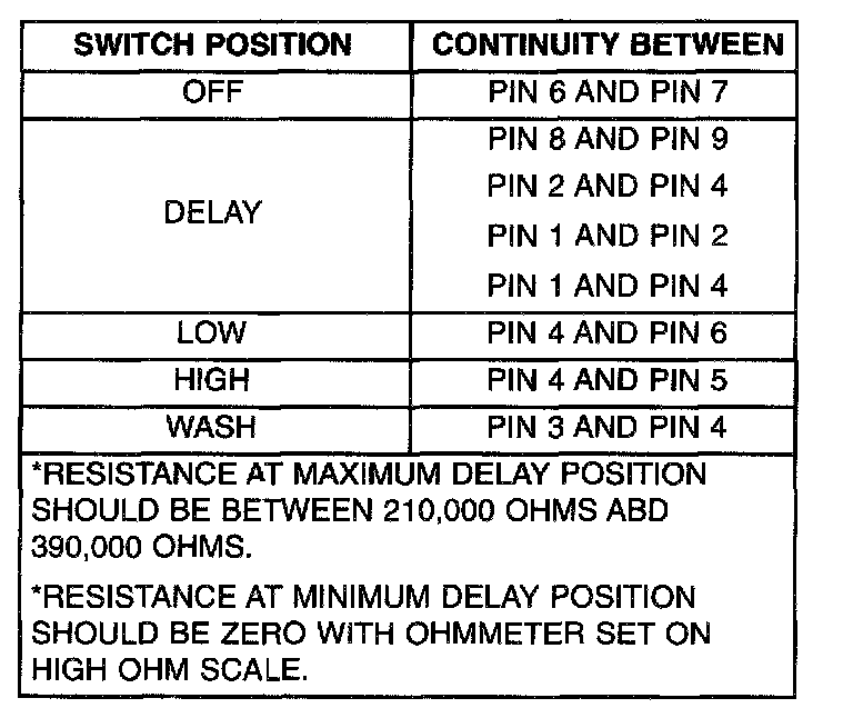 5. If the switch fails any of the continuity checks, replace the faulty switch. If the switch is OK, repair the wiper system and/or washer system wire harness circuits as required.