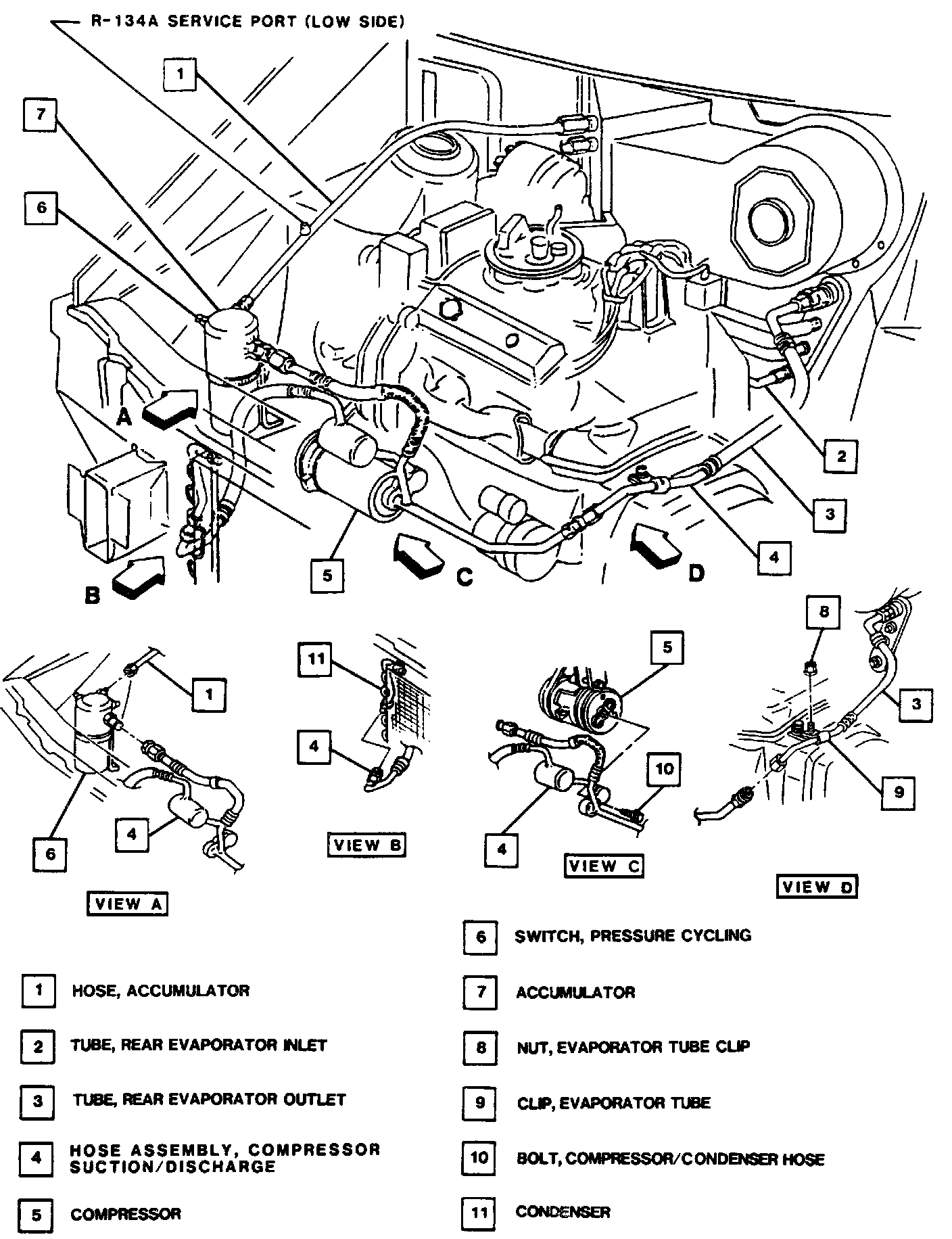 The A/C evaporator tube orifice, with its mesh screen, is located in the A/C evaporator hose between the A/C condenser and the A/C evaporator.