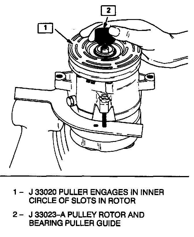 4. Hold the J 33020 puller in place and tighten the puller screw against the puller guide to remove the pulley rotor and bearing assembly.