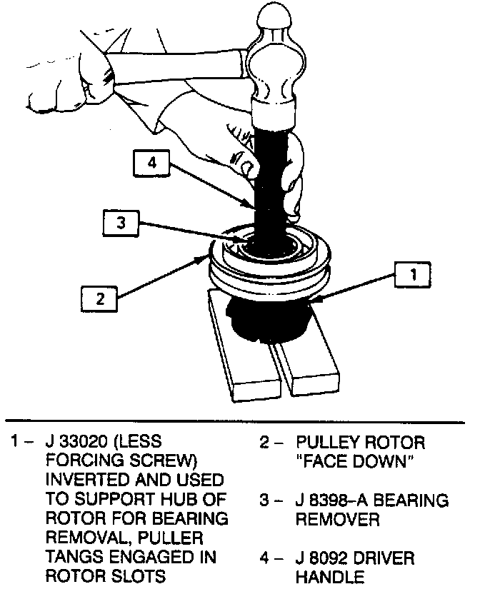 5. To prevent damage to the pulley rotor during bearing removal the rotor hub must be properly supported.