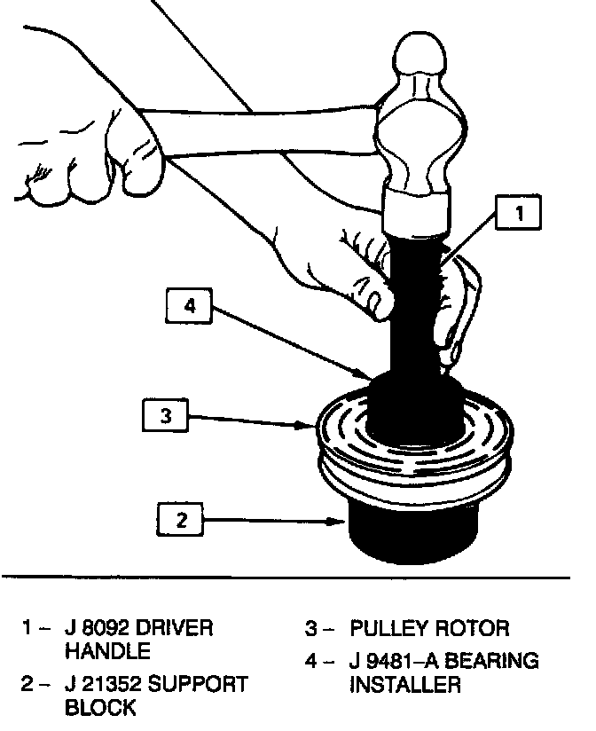 1. Place the pulley rotor on the J 21352-A support block to fully support the rotor hub during bearing installation.