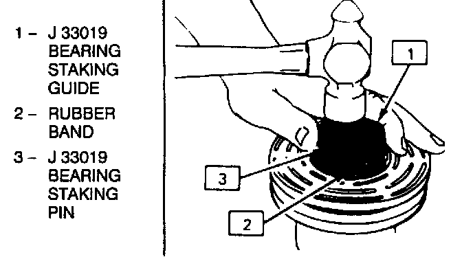 3. Place bearing staking guide J 33019-1 and bearing staking pin 133019 in the hub bore as shown in Figure 13. Shift the rotor and bearing assembly on the J 21352-A support block to give full support of the hub under the staking pin location. A heavy-duty rubber band may be used to hold the stake pin in the guide, and the stake pin should be properly positioned in the guide after each impact on the pin