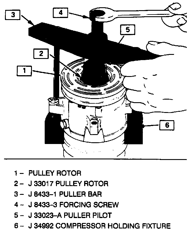 8. Tighten the center screw in the J 8433-1 puller crossbar to force the pulley rotor and bearing assembly onto the compressor front head. Should the J 33017 pulley rotor and bearing installer slip off direct in-line contact with the inner face of the bearing, loosen the J 8433-3 center forcing screw and realign the installer and pilot so that the J 33017 installer will properly clear the front head.