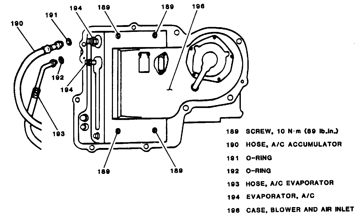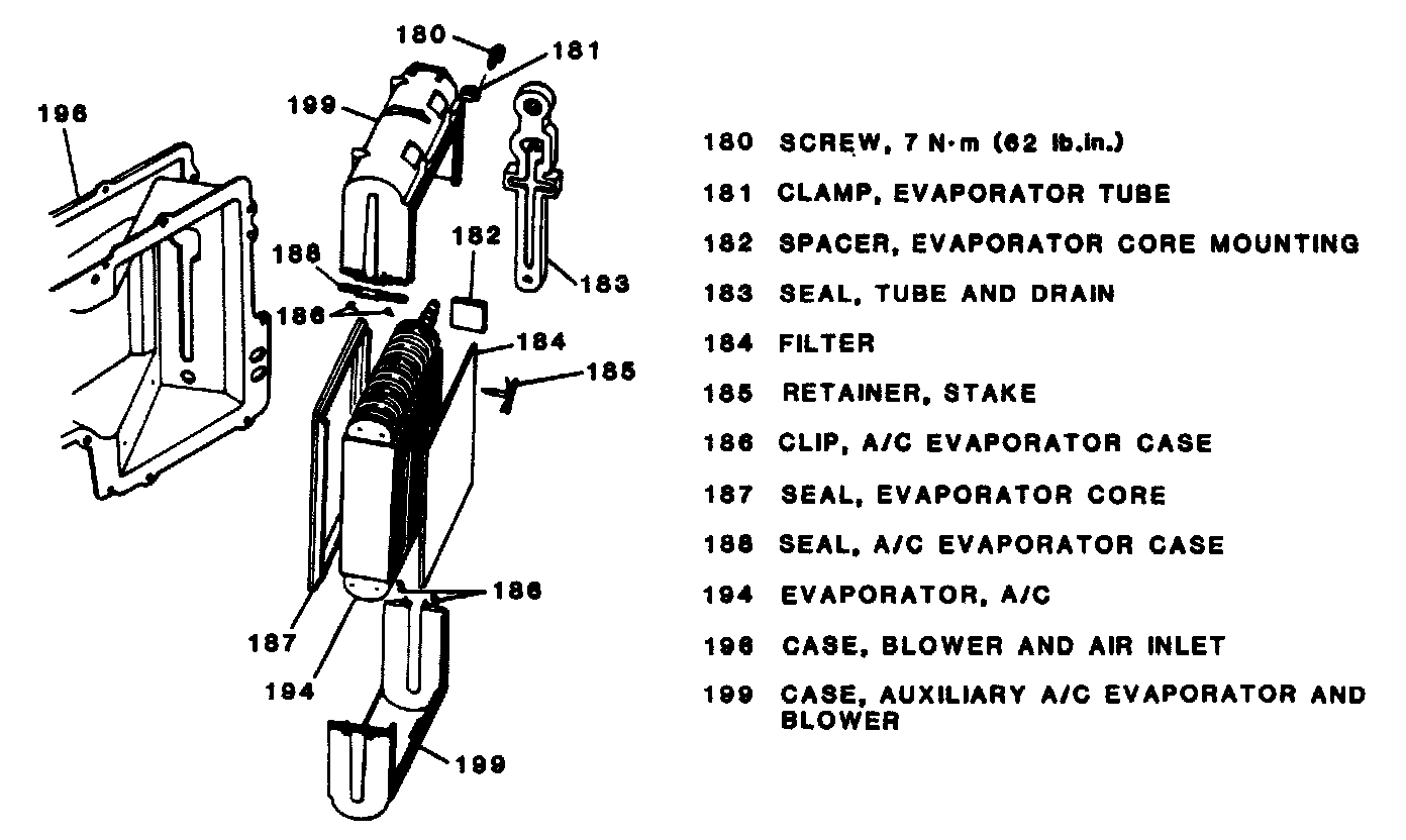 10. Four screws (189) retaifling auxiliary A/C evaporator and blower case (199) to blower and aii inlet case (196).