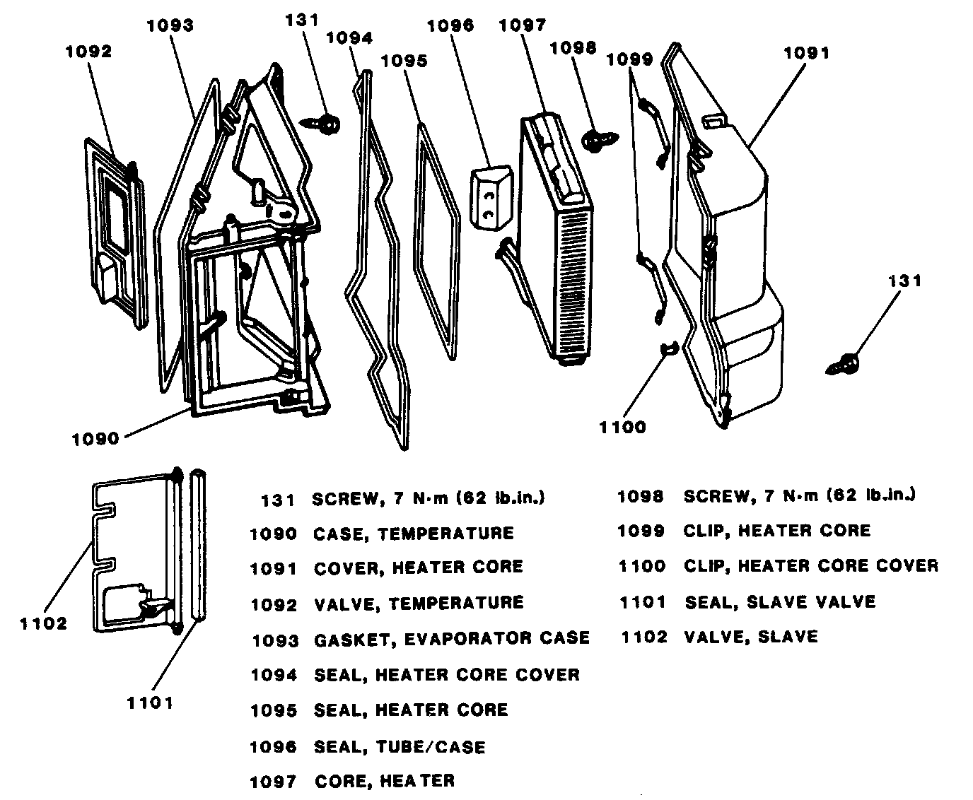 1. Heater core inlet/outlet tubes into tube/case seal and heater core and seal into temperature case (adjusting heater core upper bracket).