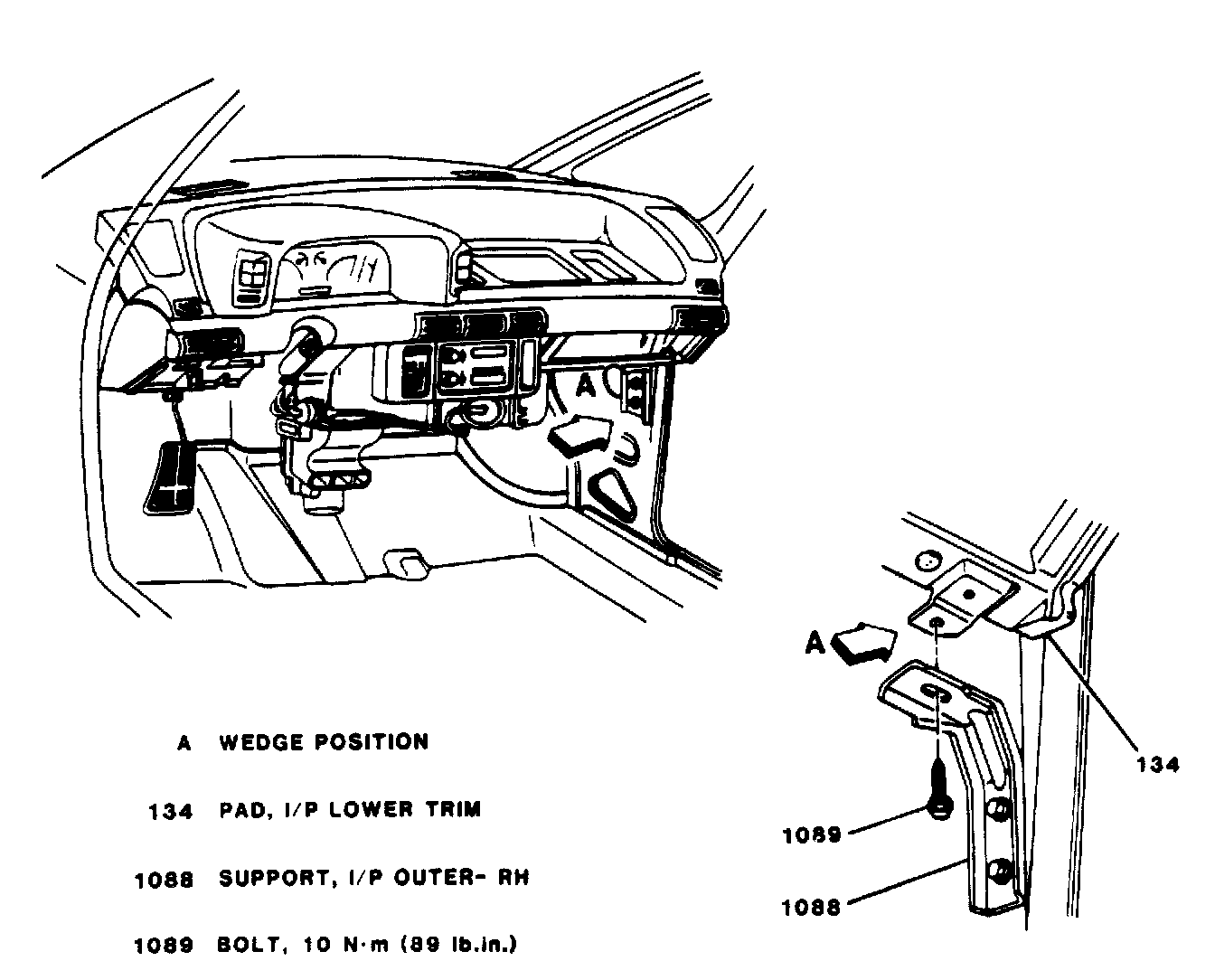 9. RH I/P outer support to I/P lower trim pad attaching bolt. Position wedge between RH I/P outer support and I/P lower trim pad.