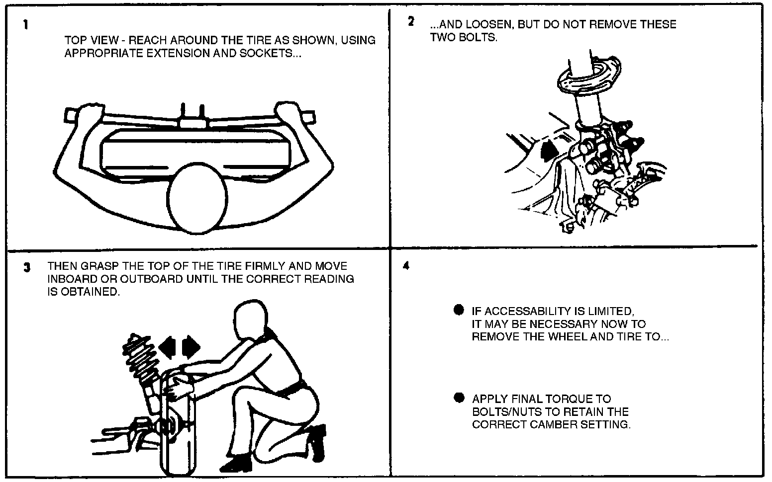 Loosen both strut-to-knuckle nuts just enough to allow movement, then adjust camber to specification as shown in Fig. 1. Tighten strut-to-knuckle nuts to specification.
