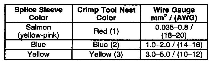 4. Select the proper sealed splice sleeve according to the wire size. Refer to the table at the beginning of the repair procedure for the color coding of the splice sleeves and the crimp tool nests.