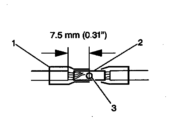 6. Place the splice sleeve in the nest. Ensure that the crimp falls midway between the end of the barrel and the stop. The sleeve has a stop (3) in the middle of the barrel (2) in order to prevent the wire (1) from going further. Close the hand crimper handles slightly in order to firmly hold the splice sleeve in the proper nest.