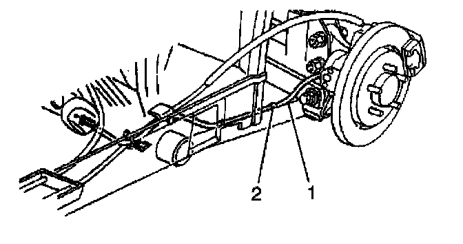 4. Disconnect the rear wheel speed sensor jumper harness connector (1) from the wheel speed sensor, located next to the rear strut (2).