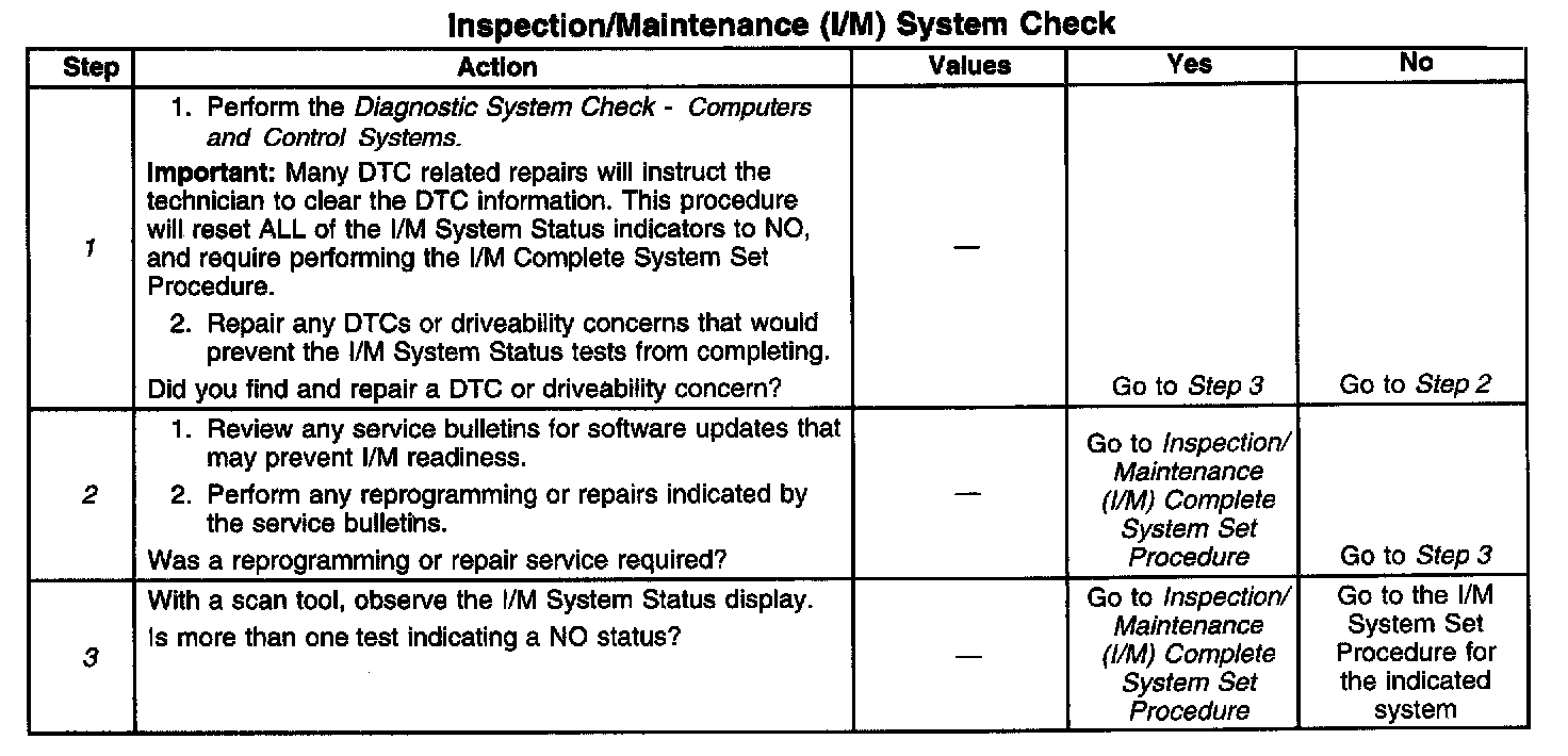 2. Anytime a control module is reprogrammed or the diagnostic trouble codes are cleared as part of a repair procedure, all the I/M System Status indicators will reset to NO.