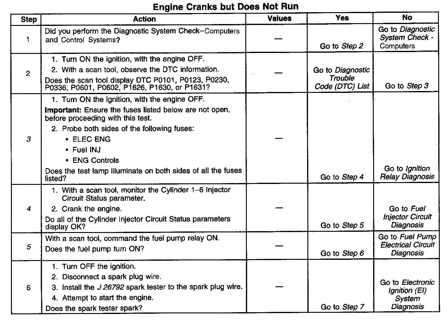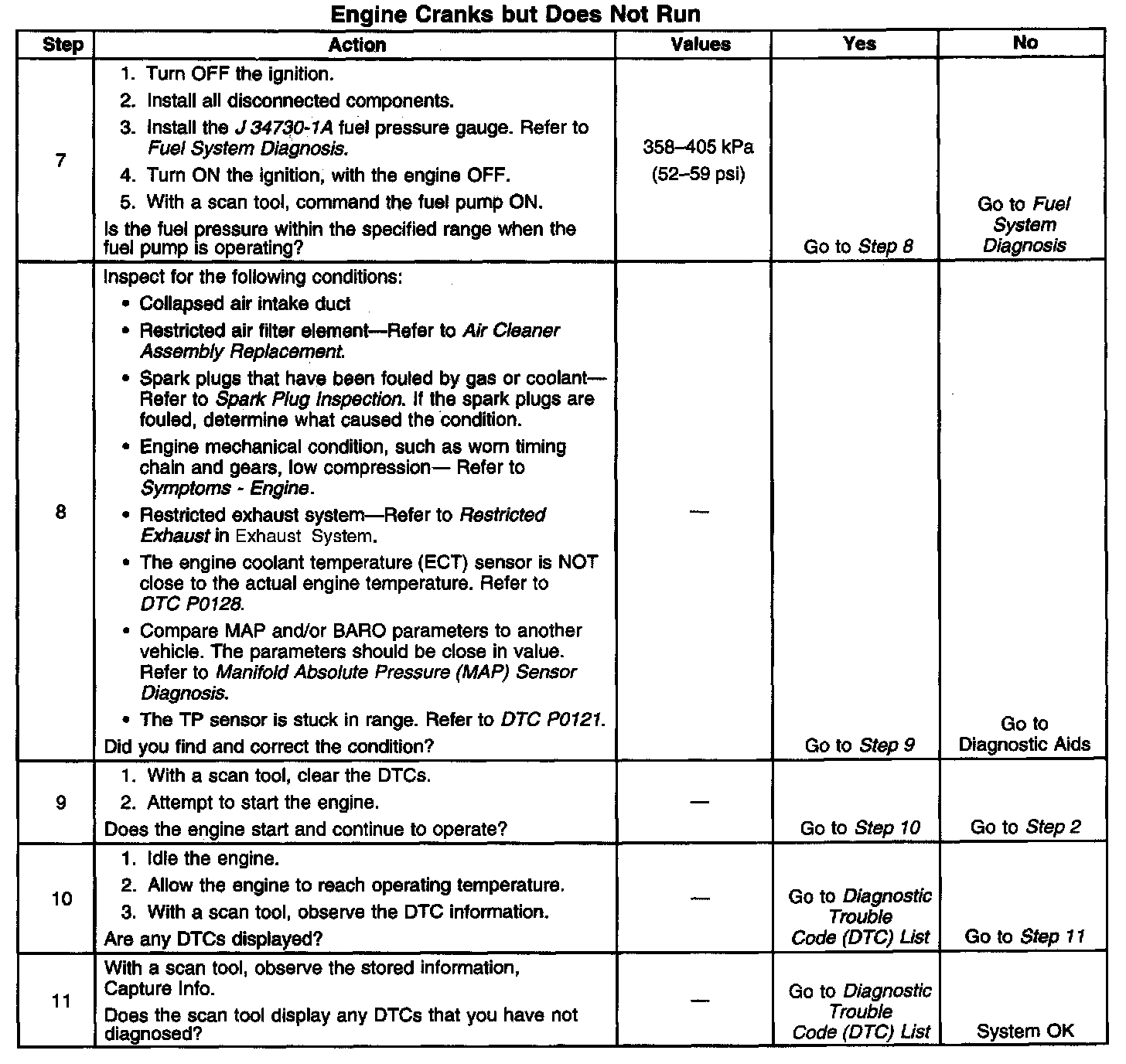 DESCRIPTIONThe Engine Cranks but Does Not Run diagnostic table is an organized approach to identifying a condition that causes an engine not to start. The Engine Cranks but Does Not Run diagnostic table directs the service technician to the appropriate system diagnosis. The Engine Cranks but Does Not Run diagnostic table assumes the following: