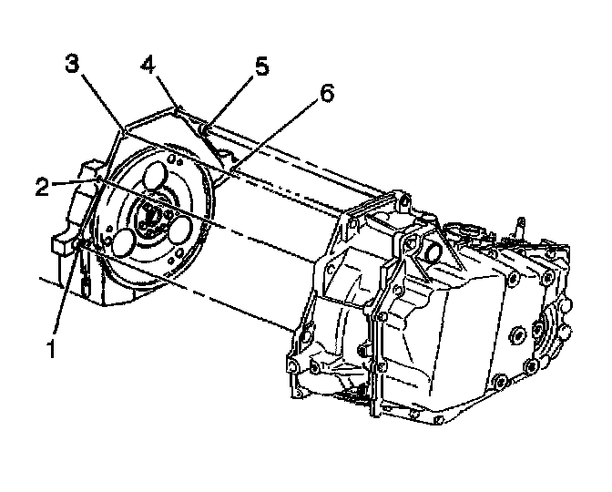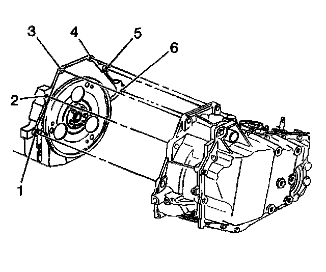 3. Install the engine-to-transaxle bolts (3, 4, 5, 6) and studs (1, 2).