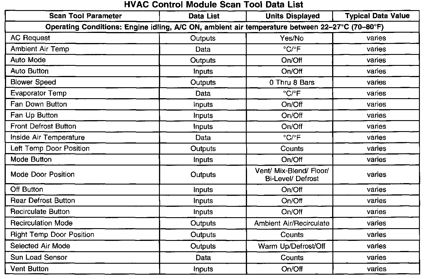 HVAC Control Module Scan Tool Data List: