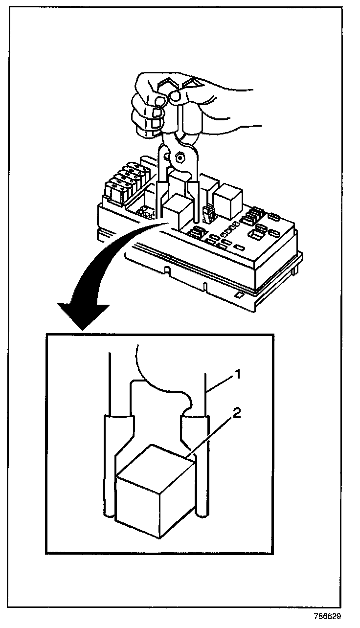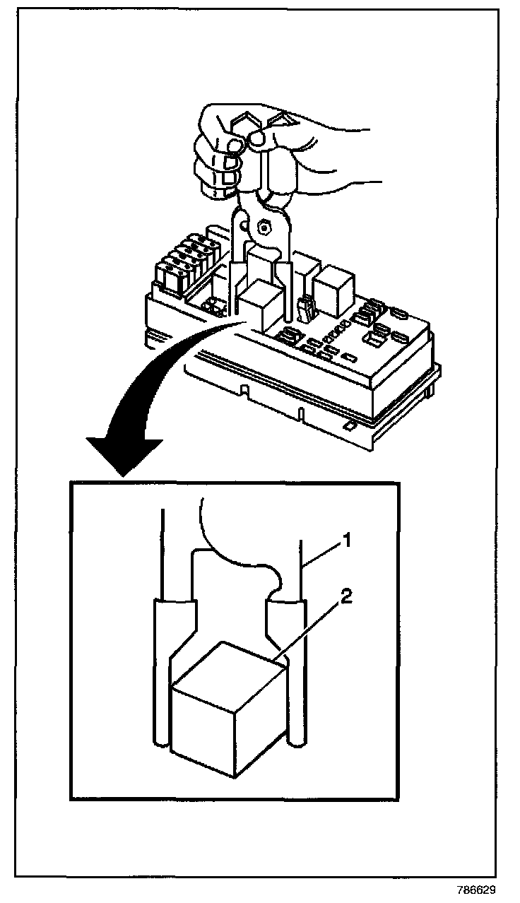 3. Using the J 43244 (1) position the tool on opposing corners of the relay (2).