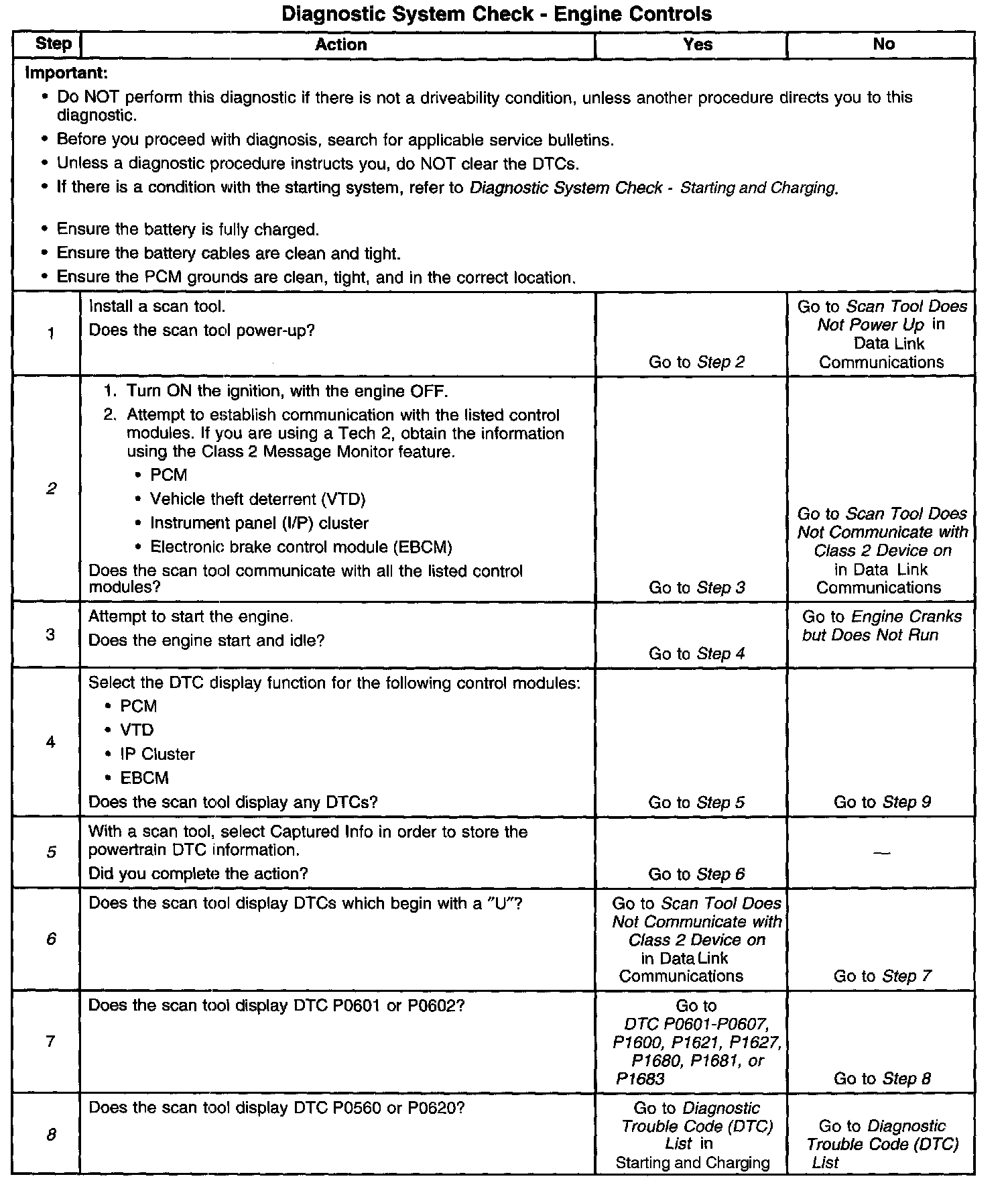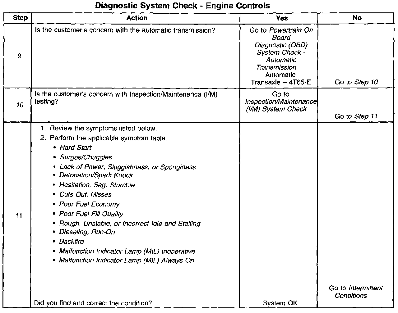 The Diagnostic System Check-Computers and Controls Systems is an organized approach to identifying a condition that is created by a malfunction in the powertrain control system. The Diagnostic System Check must be the starting point for any driveability concern. The Diagnostic System Check directs the service technician to the next logical step in order to diagnose the concern. Understanding and correctly using the diagnostic table reduces diagnostic time, and prevents the replacement of good parts.