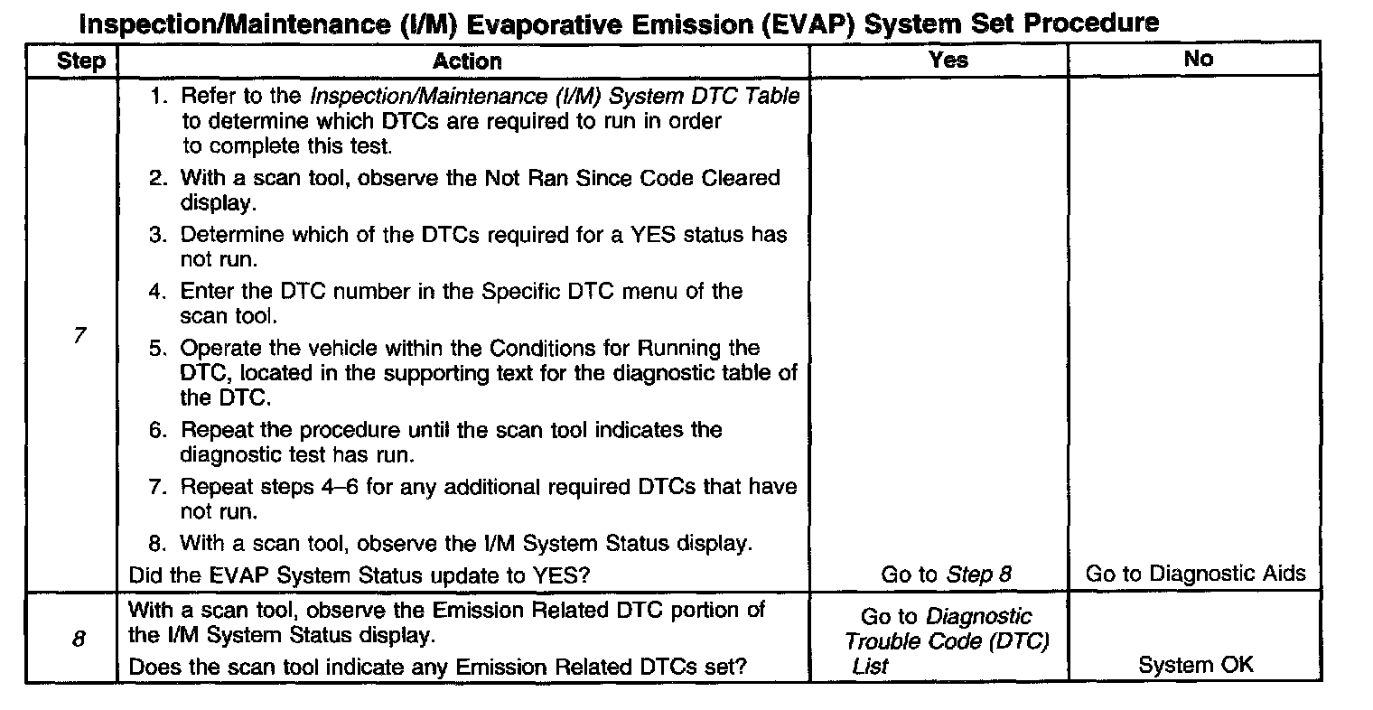 6. This step is to identify a first failure of a type B DTC. A DTC only appears on the I/M System Status display when it becomes a MIL illuminating DTC. This occurs on the second failure of a type B DTC. A first failure of a type B DTC will not allow the I/M System Status to update to YES. Refer to Diagnostic Aids.