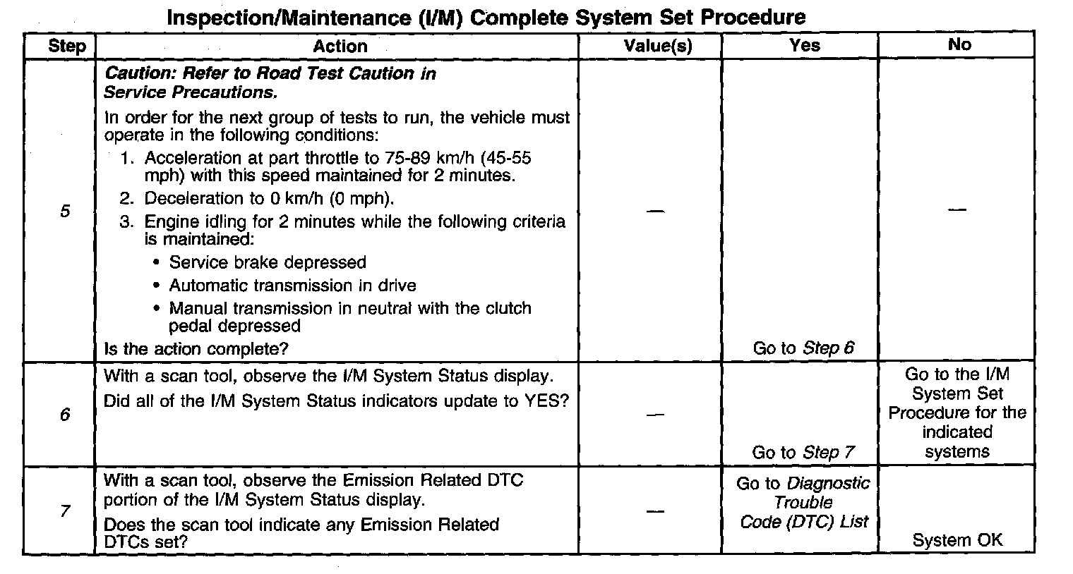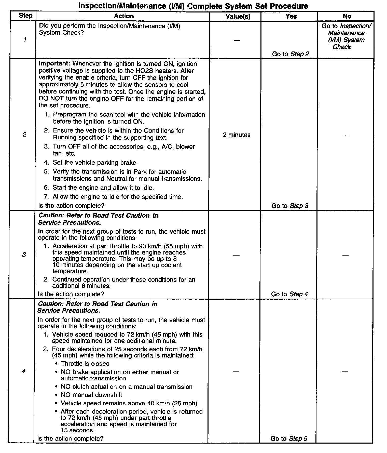 DESCRIPTIONThe purpose of the I/M Complete System Set Procedure is to satisfy the enable criteria necessary to execute all of the I/M readiness diagnostics, and complete the trips for those particular diagnostics. When all diagnostic tests are completed, the I/M System Status indicators are set to YES. Perform this test when more than one or all of the I/M System Status indicators are set to NO.