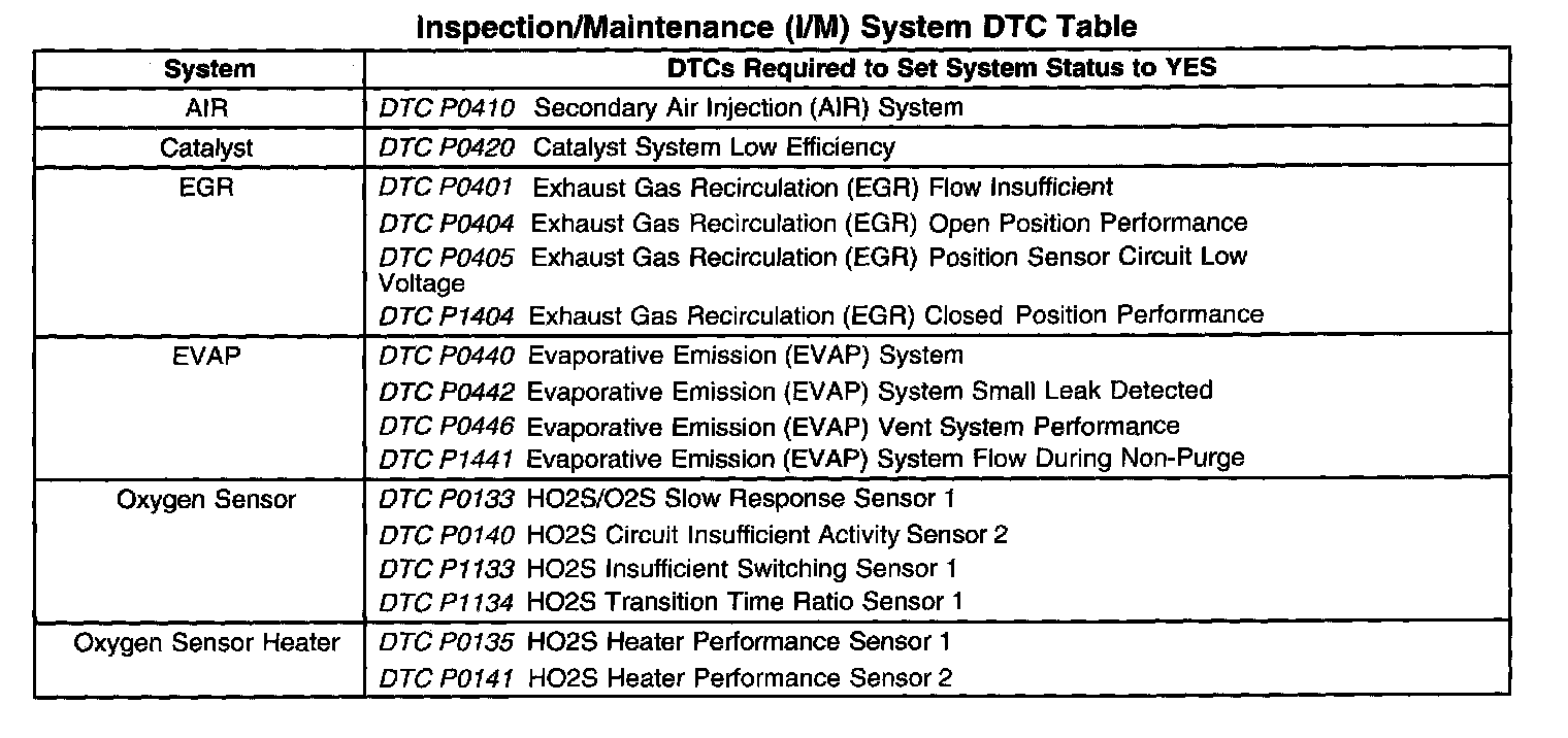 IMPORTANT: Not all vehicles will have every diagnostic trouble code (DTC) listed in each section. For example, a vehicle may have only 2 oxygen sensors or 1 catalyst. Only those DTCs applicable to the vehicle are required to update each System Status to YES. Refer to the appropriate service to determine which DTCs are supported for each vehicle.