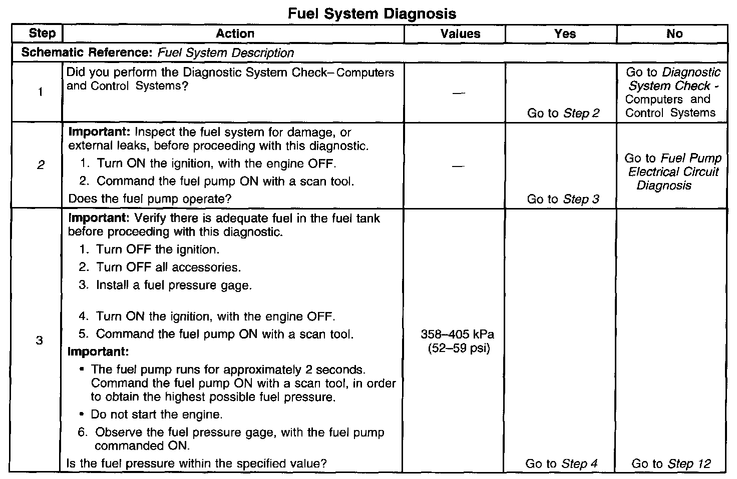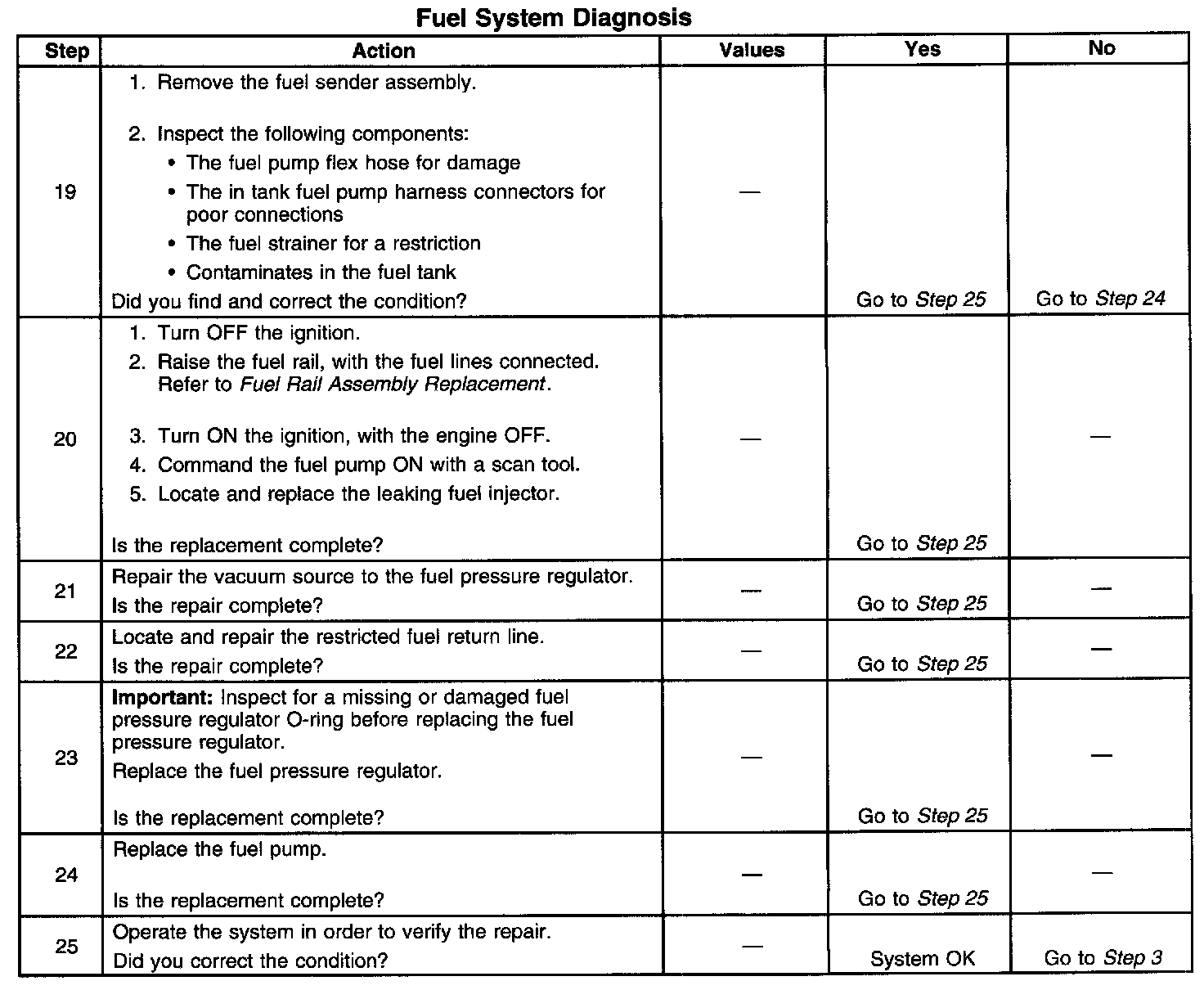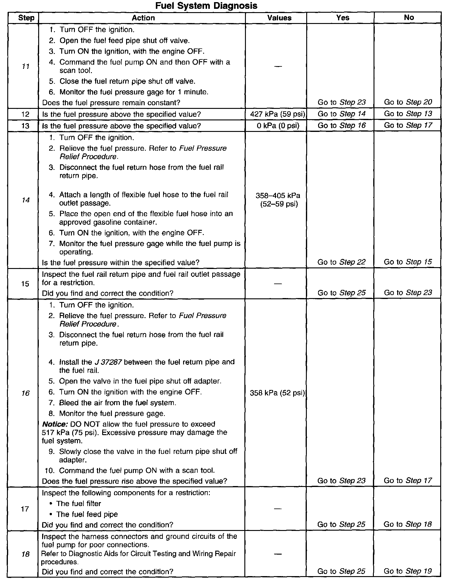 14. This step tests for a restricted fuel return pipe. If the fuel pressure is within the specified values, a restriction in the fuel return pipe is indicated.