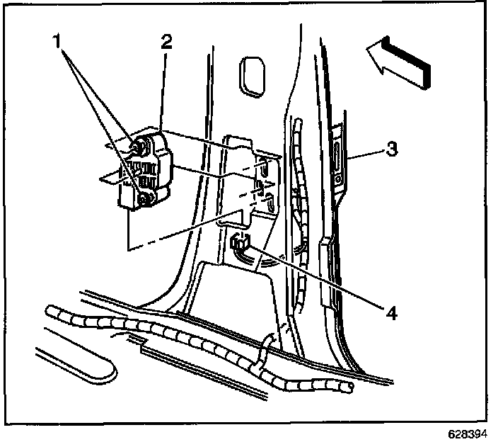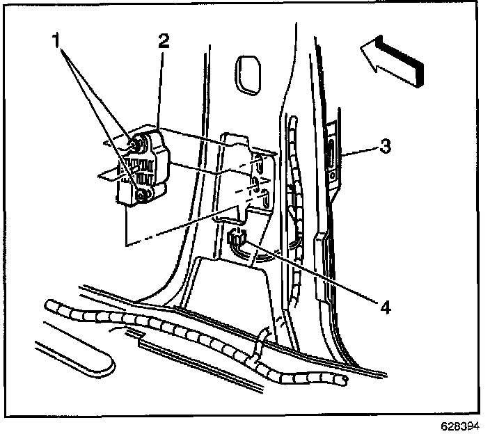 1. Install the inflatable restraint side impact sensor (2) to the center pillar.