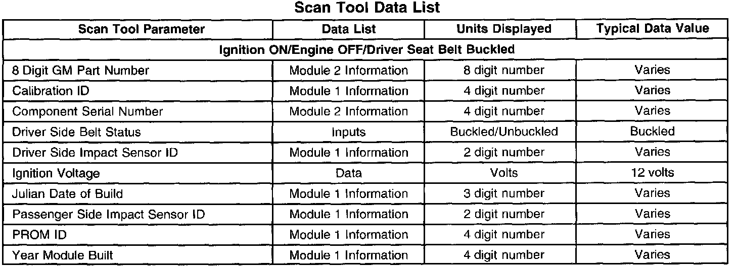 Use the SIR scan tool data list as directed by a diagnostic table or in order to supplement the diagnostic procedures. Begin all of the diagnostic procedures with the Diagnostic System Check - Restraint System..