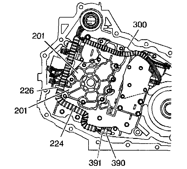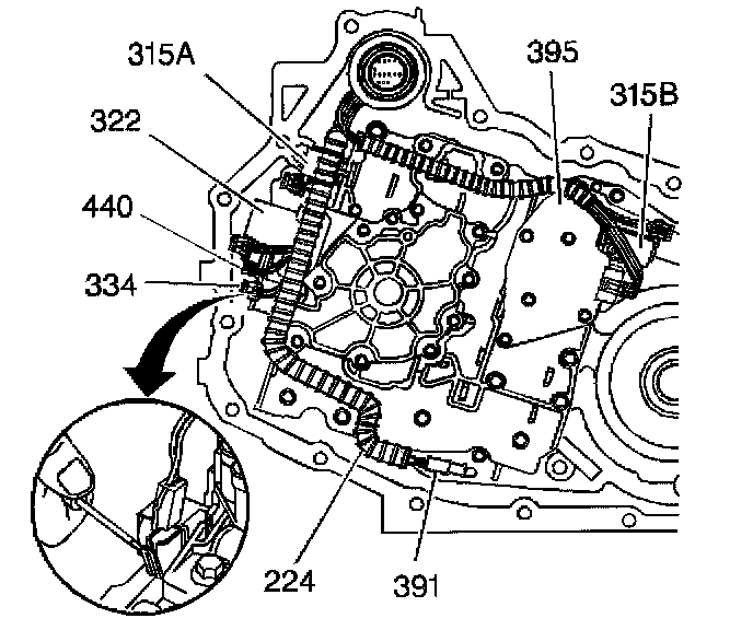 2. Use a small flat-bladed tool in order to remove the wiring harness from the solenoid valve(s) (315A, 315B, 322, 334 and/or 440), TFP manual valve position switch (395) and/or the temperature sensor (391).