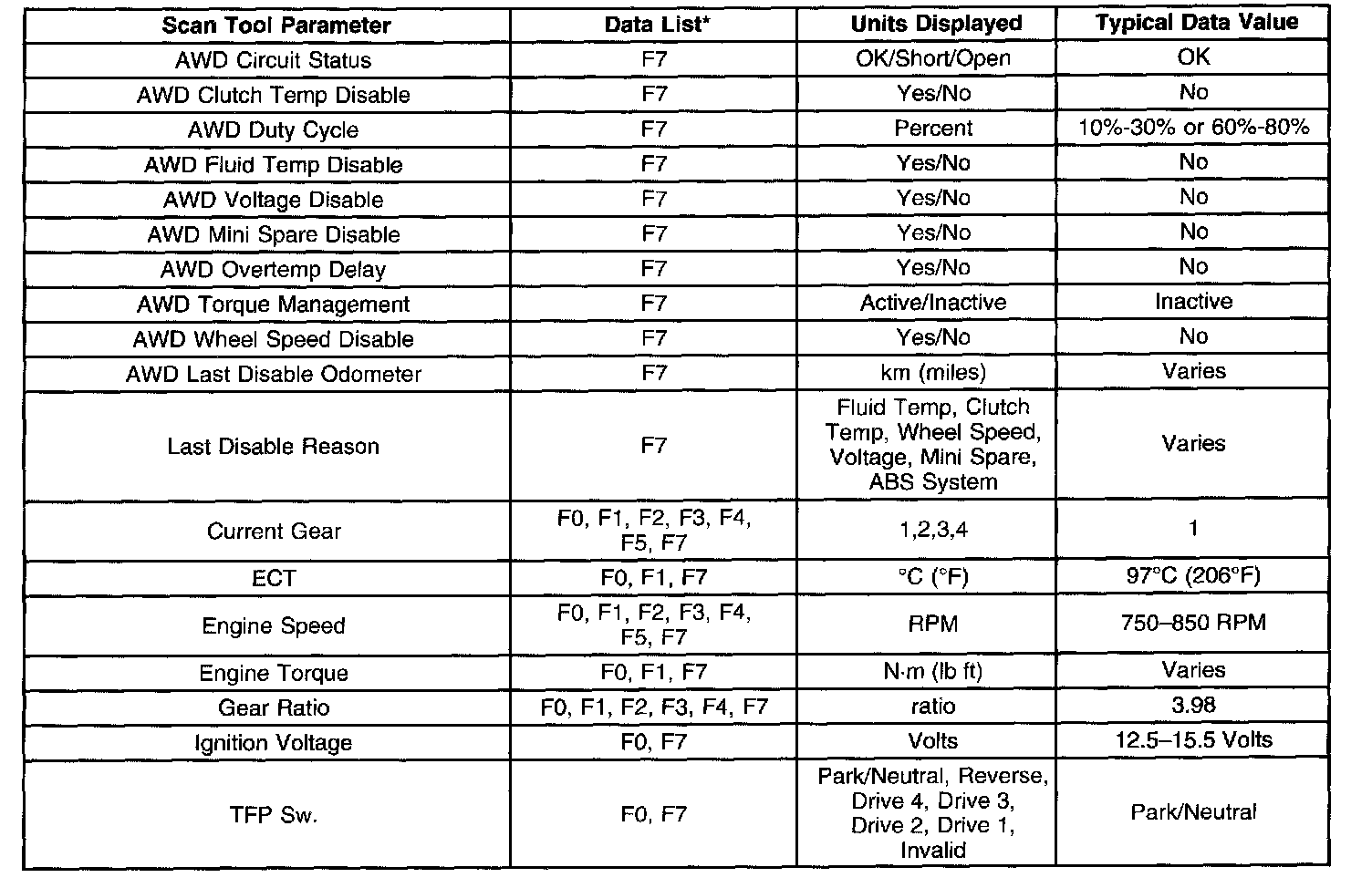 AWD Scan Tool Data List