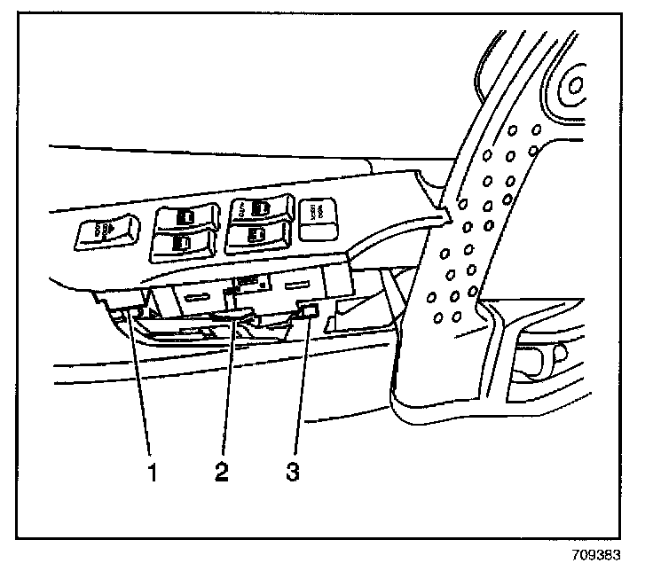 4. Remove the front door window control switch (2) from the front door window switch plate using a small flat-bladed tool.