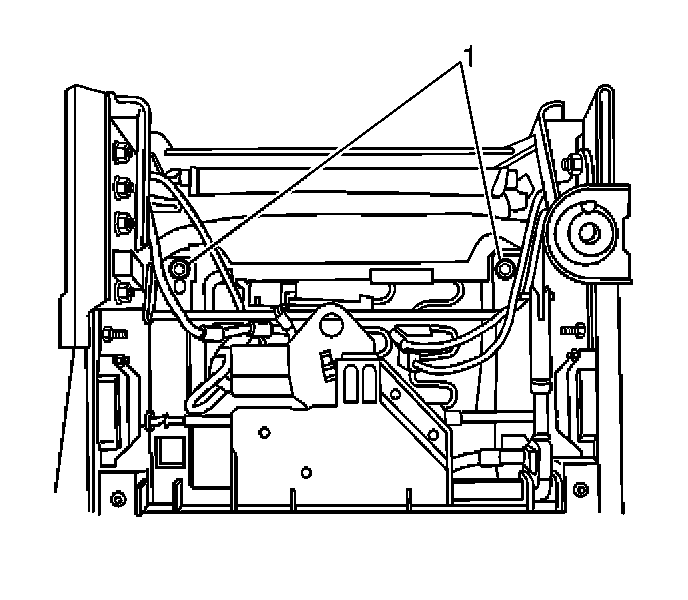 2. Adjust the front seat assembly up and forward in order to access the fasteners (1) at the rear of the front seat cushion assembly