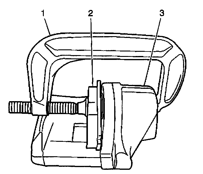 - For single piston caliper applications, insert a discarded inner brake pad (2) or block of wood in front of the piston. Using a large C-clamp (1) installed over the body of the caliper (3) and against the brake pad or block of wood, slowly bottom the piston in the bore.