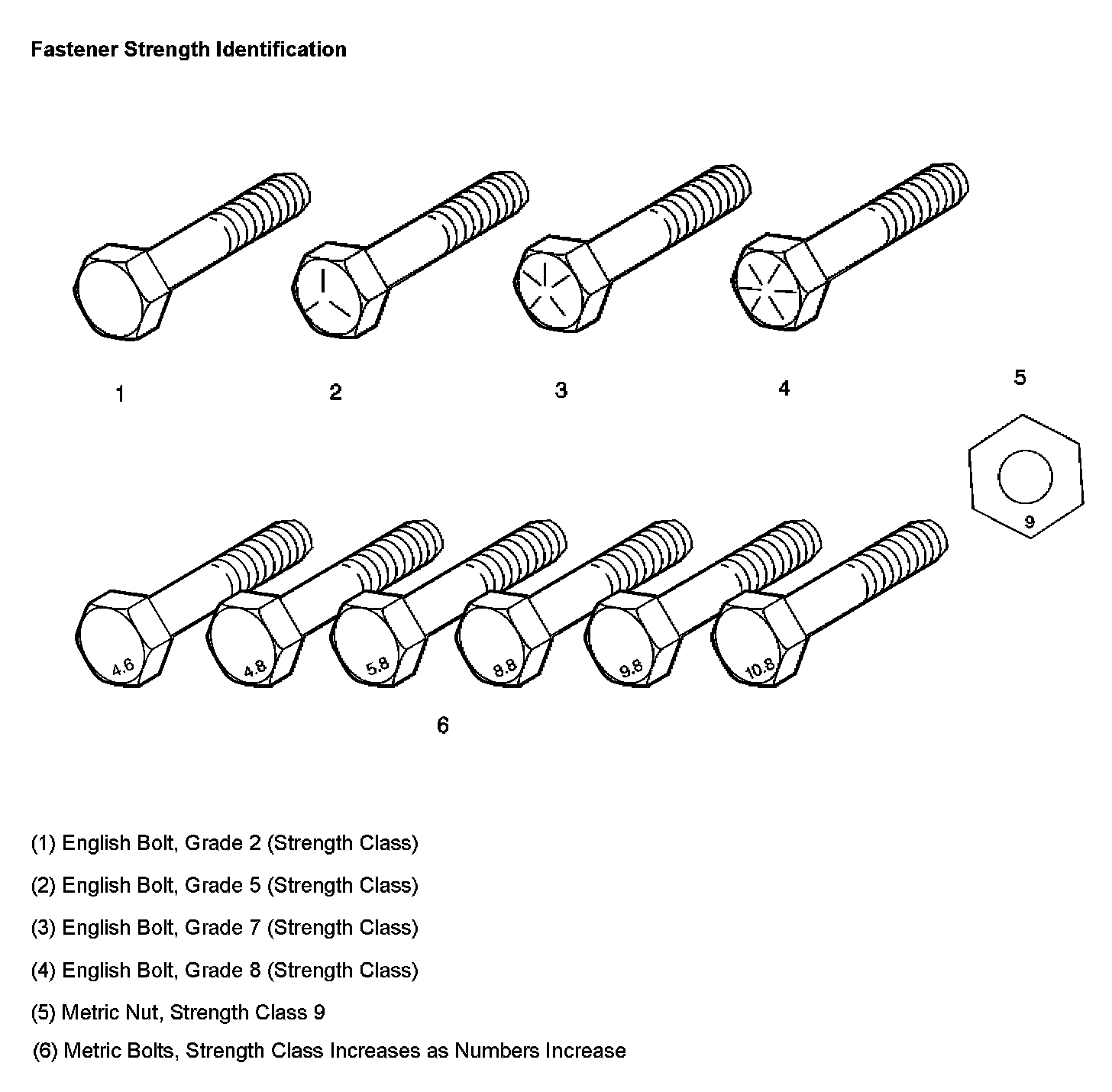 The most commonly used metric fastener strength property classes are 9.8 and 10.9. The class identification is embossed on the head of each bolt. The English, inch strength classes range from grade 2 to grade 8. Radial lines are embossed on the head of each bolt in order to identify the strength class. The number of lines on the head of the bolt is 2 lines less than the actual grade. For example, a grade 8 bolt will have 6 radial lines on the bolt head. Some metric nuts are marked with a single digit strength identification number on the nut face.