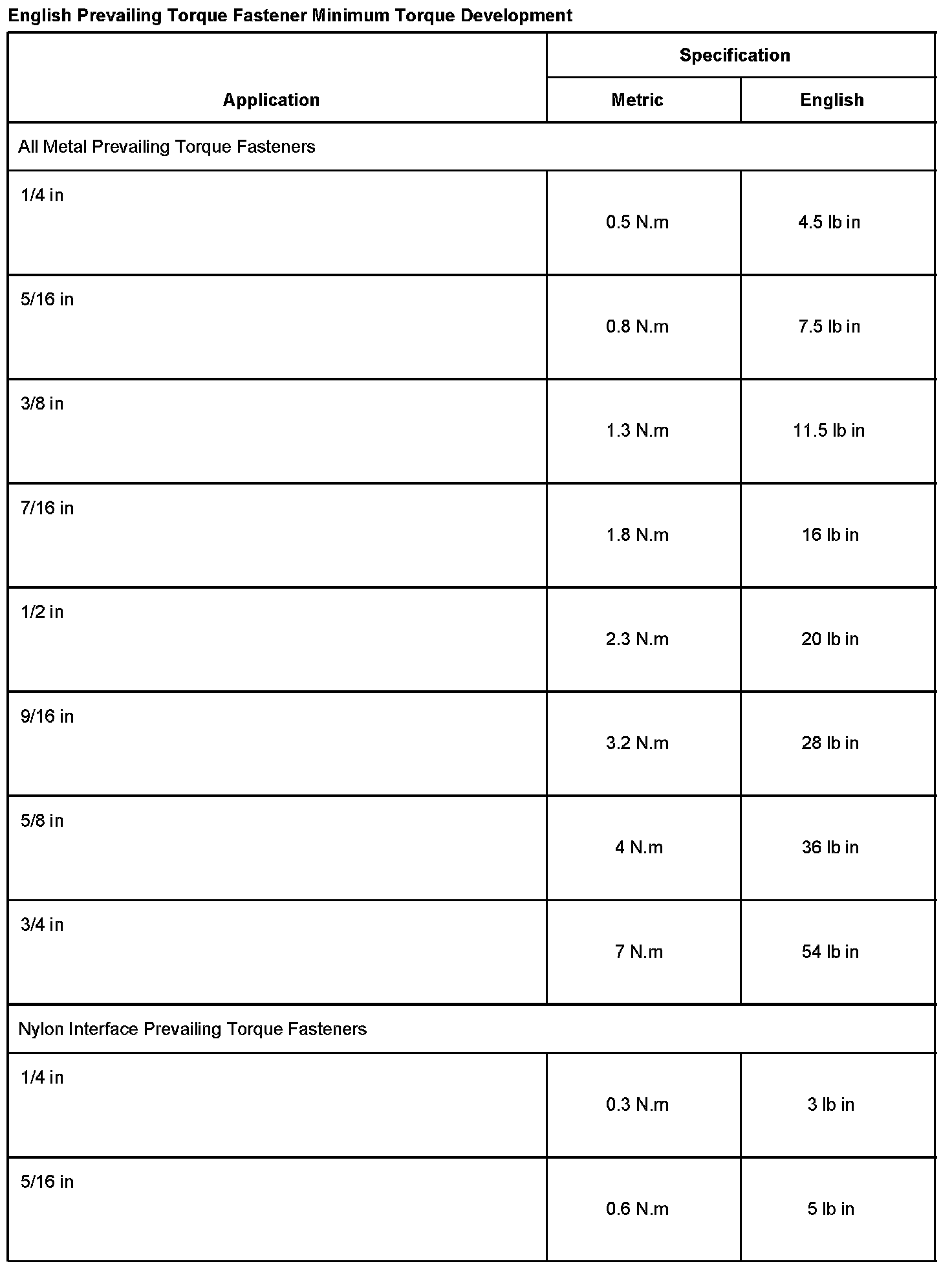 ENGLISH PREVAILING TORQUE FASTENER MINIMUM TORQUE DEVELOPMENT