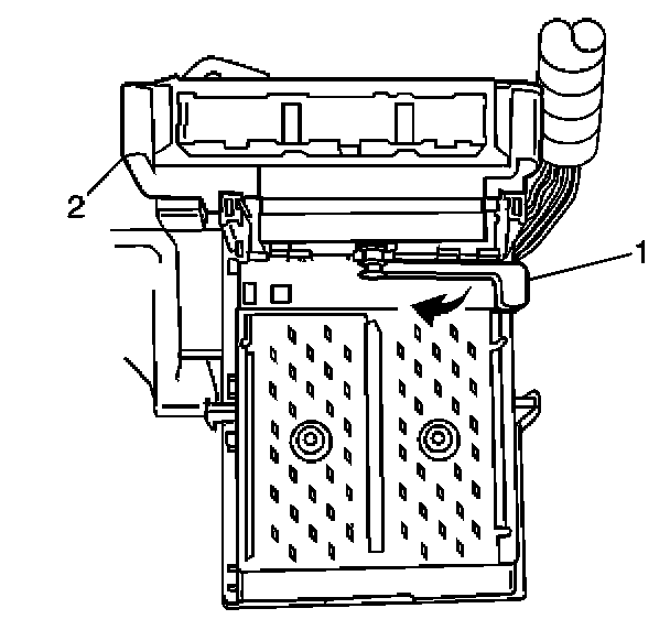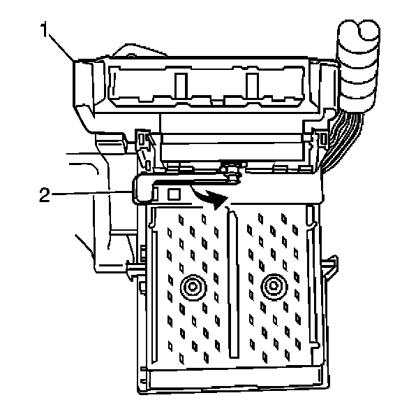 2. Rotate the BCM retaining lever (2) to secure the BCM to the console accessory wiring junction block.
