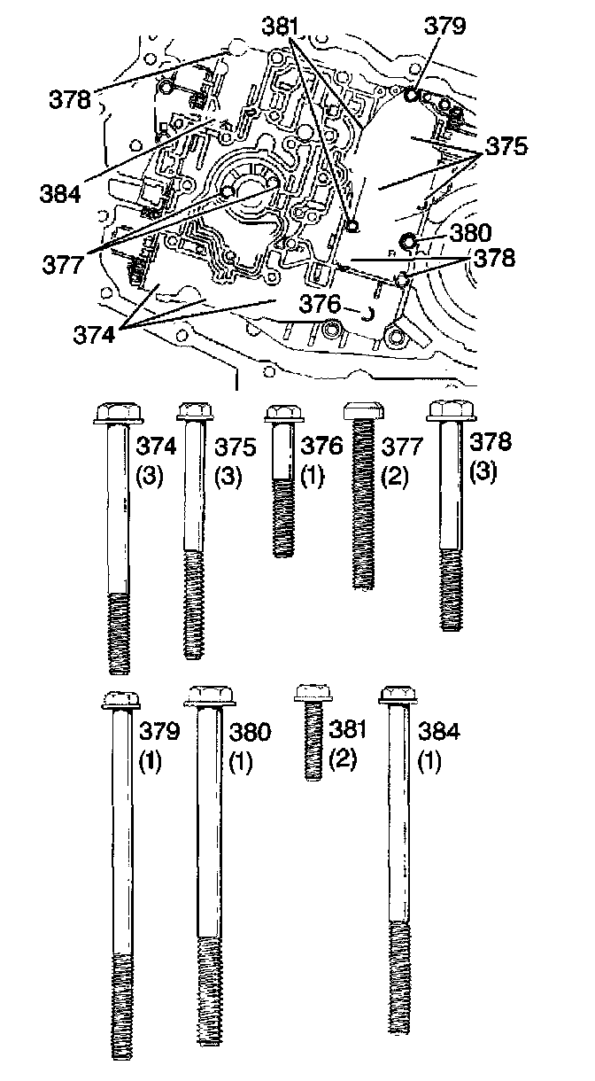 3. Remove the valve body bolts (374-381, 384).