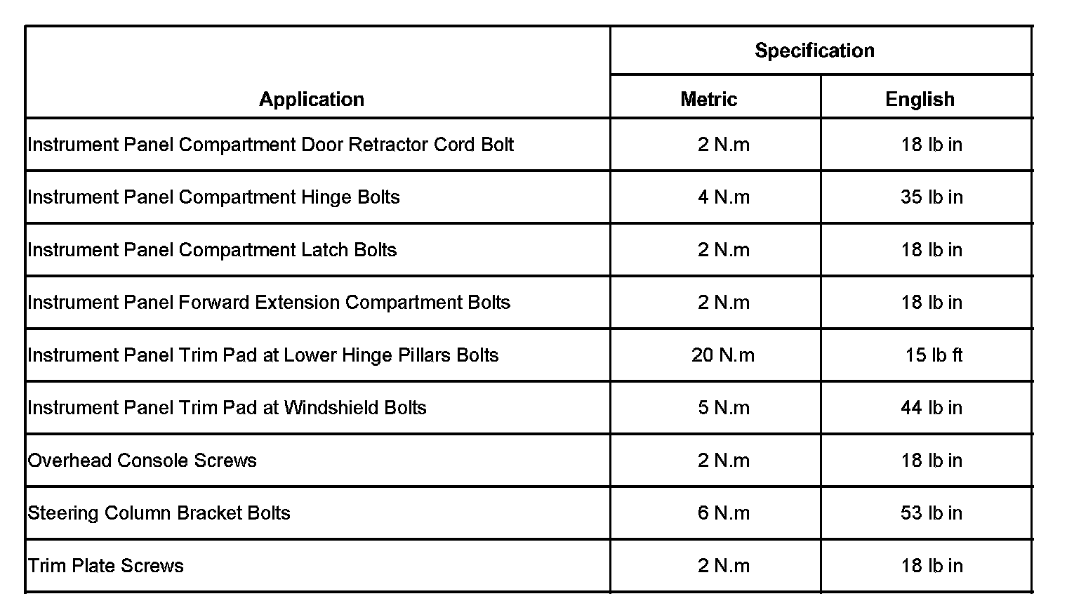 Instrument Panel, Gauges and Warning Indicators: Specifications