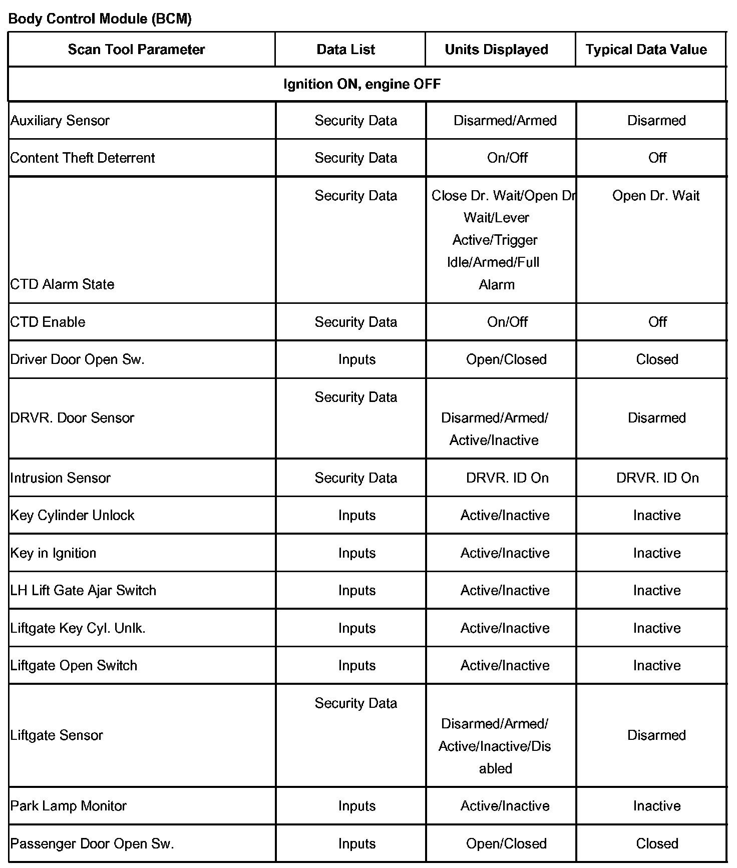 Scan Tool Data List - Vehicle Theft Deterrent: