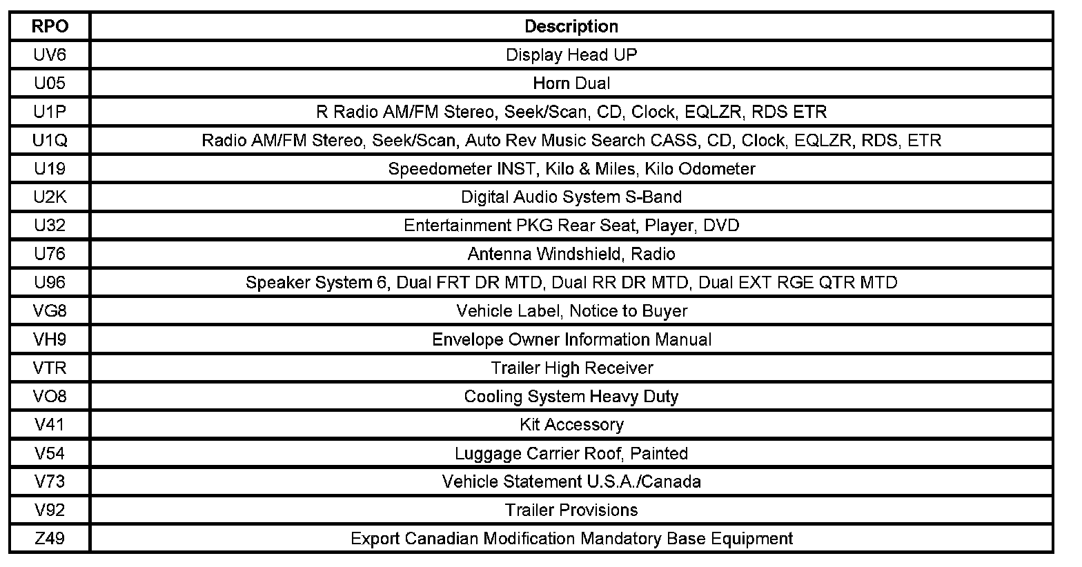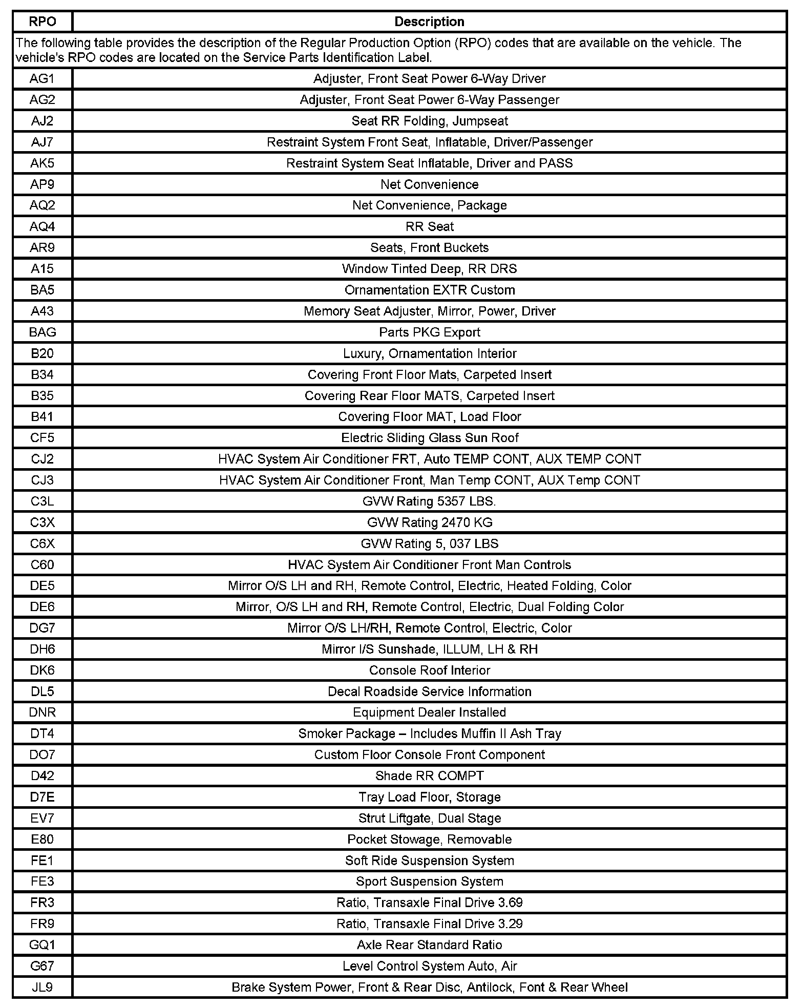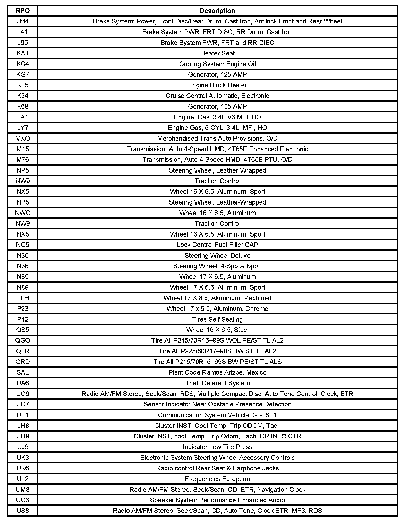RPO Code List 1: