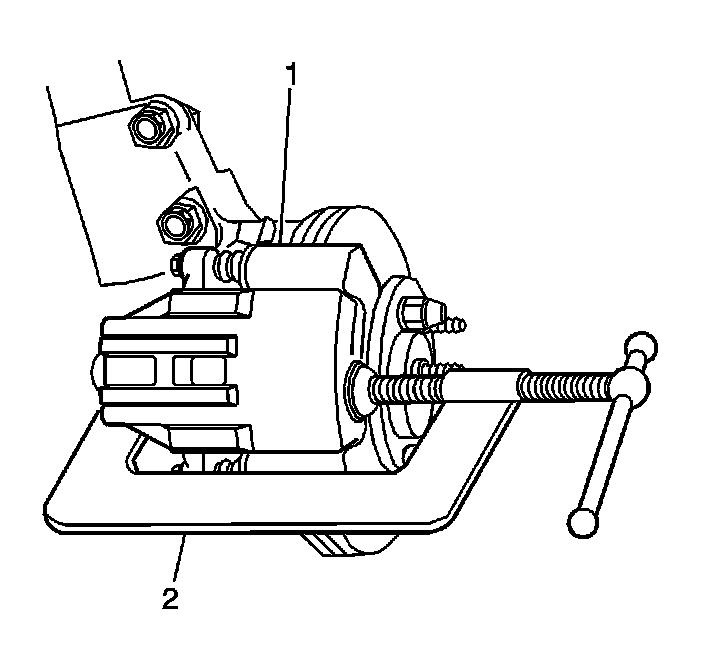 6. Install a large C-clamp (2) over the top of the brake caliper and against the back of the outboard brake pad.