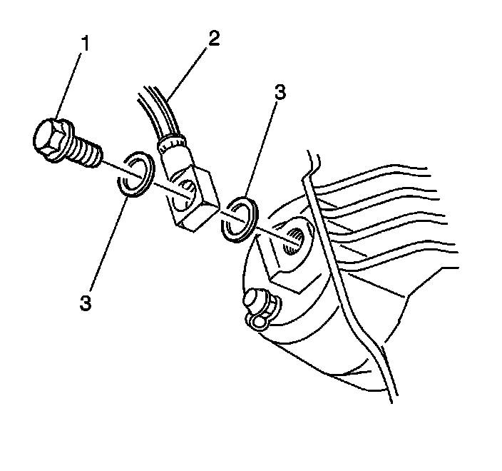 Assemble the brake hose bolt (1) and the NEW copper brake hose gaskets (3) to the brake hose (2).