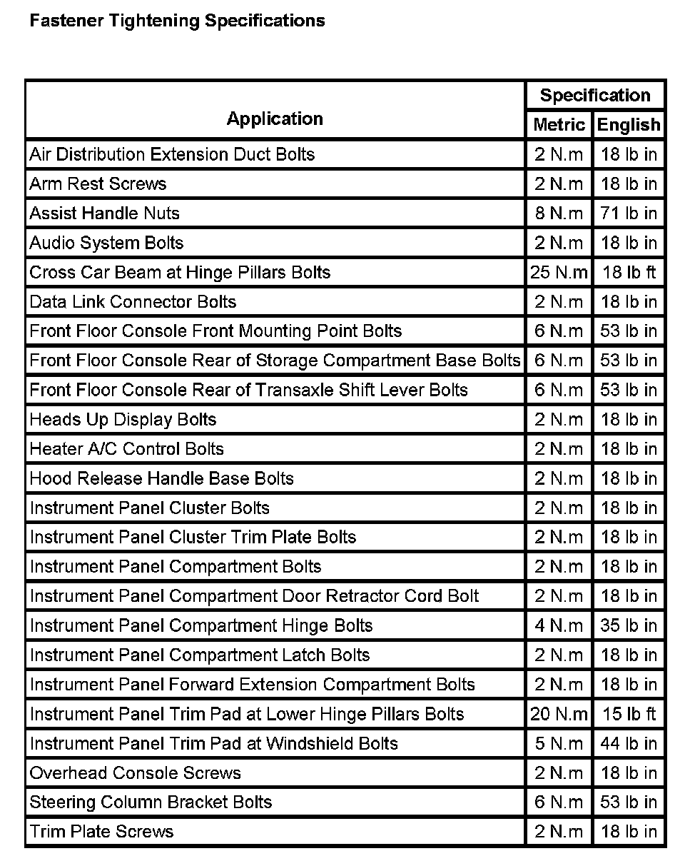 Instrument Panel, Gauges and Warning Indicators: Specifications