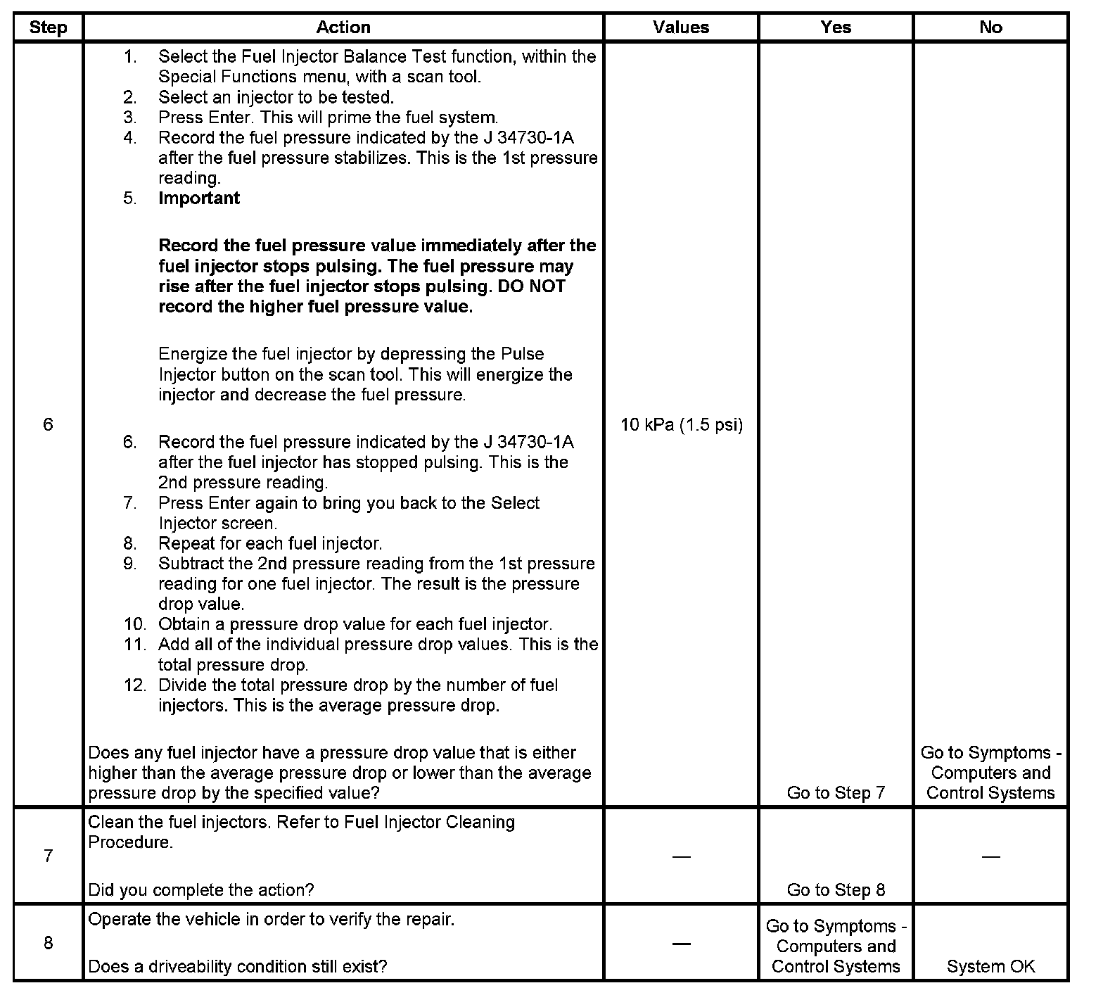 6. If the pressure drop value for each fuel injector is within 10 kPa (1.5 psi) of the average pressure drop value, the fuel injectors are flowing properly.