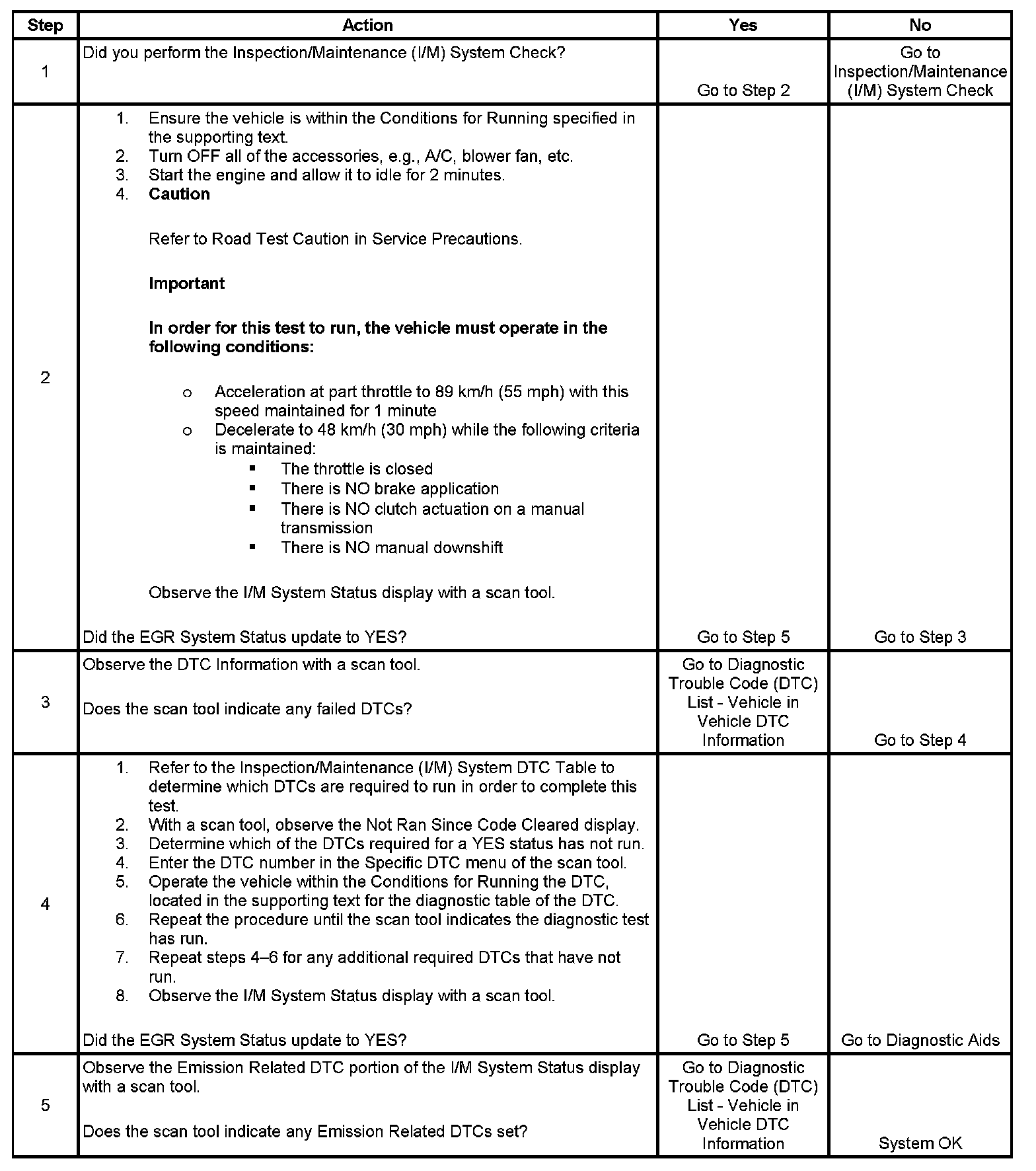 The control module only runs the EGR Active Tests during a gradual deceleration with a closed throttle and a vehicle speed above 48 km/h (30 mph). Several deceleration cycles may be necessary in order to accumulate a sufficient number of EGR flow samples. The procedure outlined in the table is for a clear, flat road. If the procedure is performed on a road with a slight down hill grade, the test may acquire the necessary sample counters in one or two decel trips. If the test is interrupted during the procedure, it may take more than three deceleration cycles to complete the test. If the status does not update, the test outlined in this procedure can be repeated until the I/M System Status updates to YES.