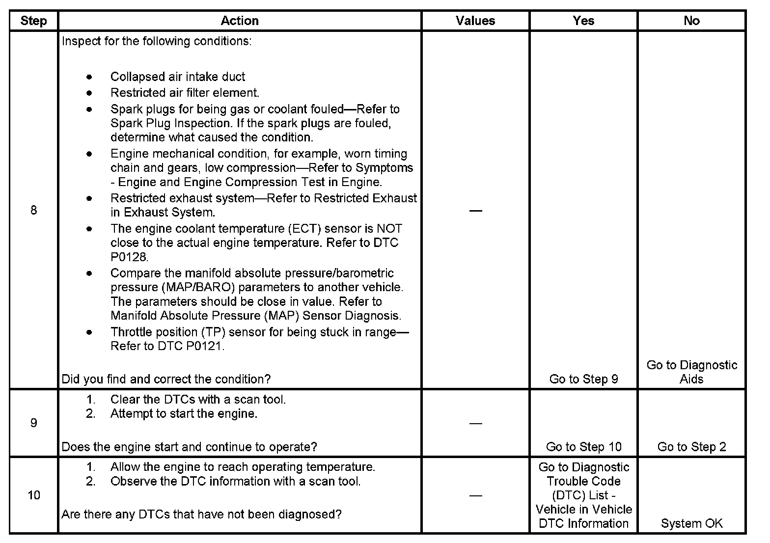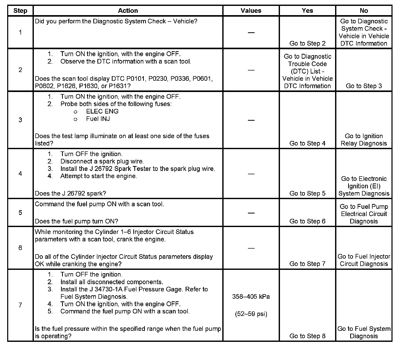 The Engine Cranks but Does Not Run diagnostic table is an organized approach to identifying a condition that causes an engine not to start. The Engine Cranks but Does Not Run diagnostic table directs the service technician to the appropriate system diagnosis.